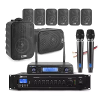 Zestaw czarnych głośników naściennych 8 x 3" BC30V z wzmacniaczem oraz zestawem mikrofonów bezprzewodowychKod: 952.100 set8