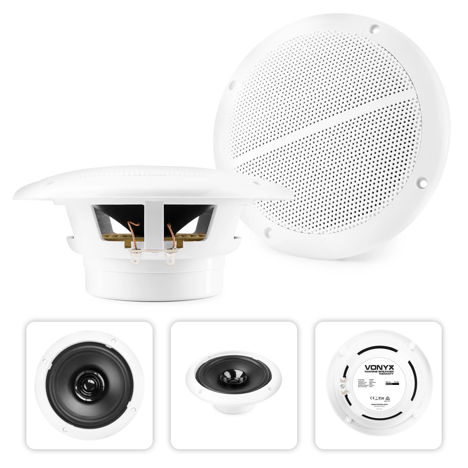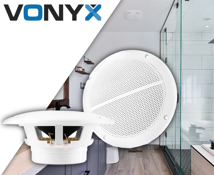 Wodoodporne głośniki do montażu podtynkowego (np. sufitowego lub ściennego) holenderskiej marki Vonyx. Idealne do zastosowań morskich i instalacji PA, takich jak baseny, łazienki oraz inne miejsca o podwyższonej wilgotności.