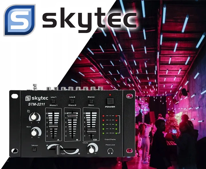 Stereofoniczny mikser marki Skytec przeznaczony dla początkujących DJ-ów