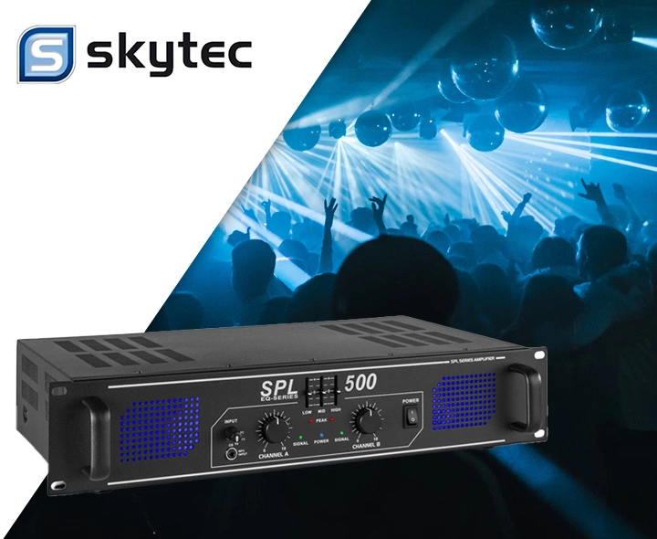 Wzmacniacz Skytec SPL500 posiada wiele wejść, które pozwolą na podłączenie telewizorów, odtwarzaczy CD/DVD, PC do RCA itp. W ten sam sposób można podłączyć odtwarzacz MP3 do gniazda na przednim panelu. Jego solidna konstrukcja przeznaczona jest do łatwego i bezpiecznego transportu z możliwością montażu na stelażu 19”. Urządzenie posiada niebieskie podświetlenie LED.