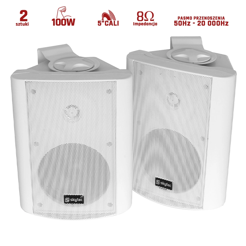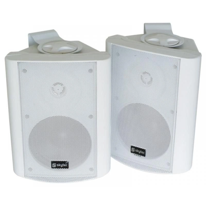 Para kompaktowych dwudrożnych kolumn stereo SkyTec w obudowie typu ABS z solidnym metalowym grillem. Kolumna może stać luźno lub może być zawieszona na ścianie/suficie. Dzięki trapezoidalnemu kształtowi idealnie pasuje do montażu w rogach, dzięki czemu możesz stworzyć świetny system Hi-fi lub surround.