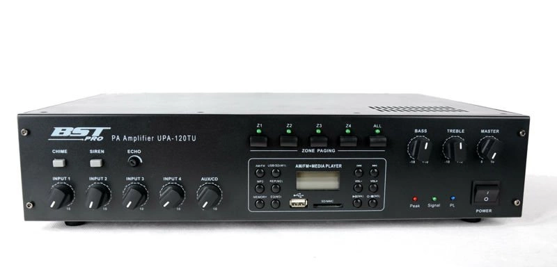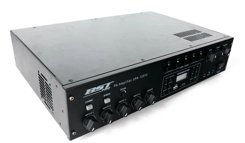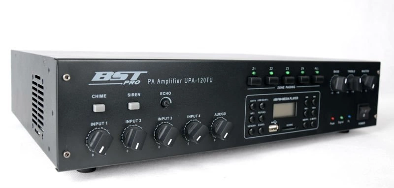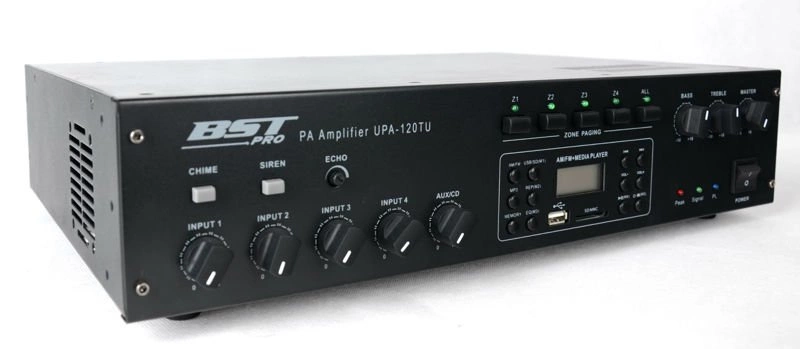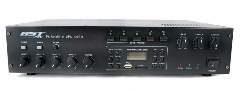 Wzmacniacz z mikserem do dystrybucji 100V z możliwością podłączenia niskoimpedancyjnego 4-8 omów i 4-strefowym odłącznikiem linii. Przeznaczony jest do 19" RACK. Moc wzmacniacza to 120W. Posiada wbudowany odtwarzacz USB/SD/MP3 z wyświetlaczem LCD i tunerem AM/FM. Zawiera 4x wejście MIC z możliwością włączenia zasilania phantom 48V , 1x wejście LINE, wejście telefoniczne i 1x wyjście REC Korekcja 2-pasmowa, regulacja głośności Wzmacniacz posiada wbudowany gong oraz syrenę o najwyższym priorytecie nad innymi wejściami.