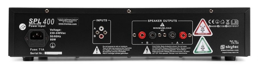 Profesjonalny wzmacniacz Skytec SPL400 ma doskonałą jakość dźwięku! Jest idealny dla DJ-ów lub w instalacjach HIFI. Bardzo mobilny, będzie szczególnie doceniany na małych koncertach, pokazach i innych wydarzeniach, dzięki mocowaniu do szafy 19”. Jest również szeroko stosowany w instalacjach kina domowego, aby cieszyć się dźwiękiem wysokiej jakości.