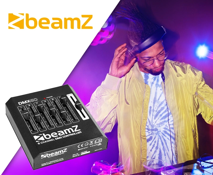 Sterownik oświetlenia DMX60 marki BeamZ z sześcioma, indywidualnymi kanałami z suwakami ułatwiającymi kontrolę efektami świetlnymi, reflektorami, laserami i wszelkimi urządzeniami, które posiadają opcję sterowania poprzez DMX. Dzięki zasilaniu bateryjnemu, oraz niewielkim rozmiarom sterownik można zabrać ze sobą praktycznie wszędzie.