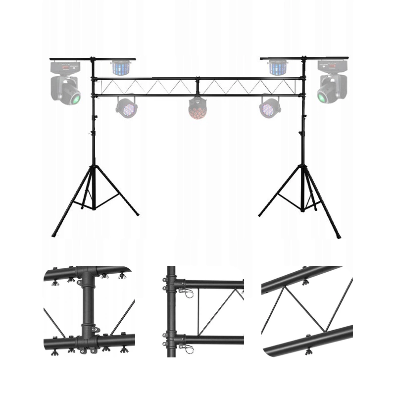 LB60 jest skonstruowany w taki sposób, aby jego konfiguracja była szybka i łatwa. Dzięki poręcznym złączkom całość jest łatwa w montażu, dzięki czemu możesz szybko pokazać i uruchomić swoje światło. Oba teowniki są wyposażone w otwory, dzięki czemu np. spoty Par mogą pozostać zamontowane na pręcie. Na statywie można umieścić jednocześnie oba teowniki wraz ze spotami, co oczywiście pozwala zaoszczędzić sporo czasu. Kratownica pozioma ma również otwory montażowe do zawieszania efektów świetlnych. Oczywiście istnieje również możliwość zawieszenia oświetlenia za pomocą haczyków.