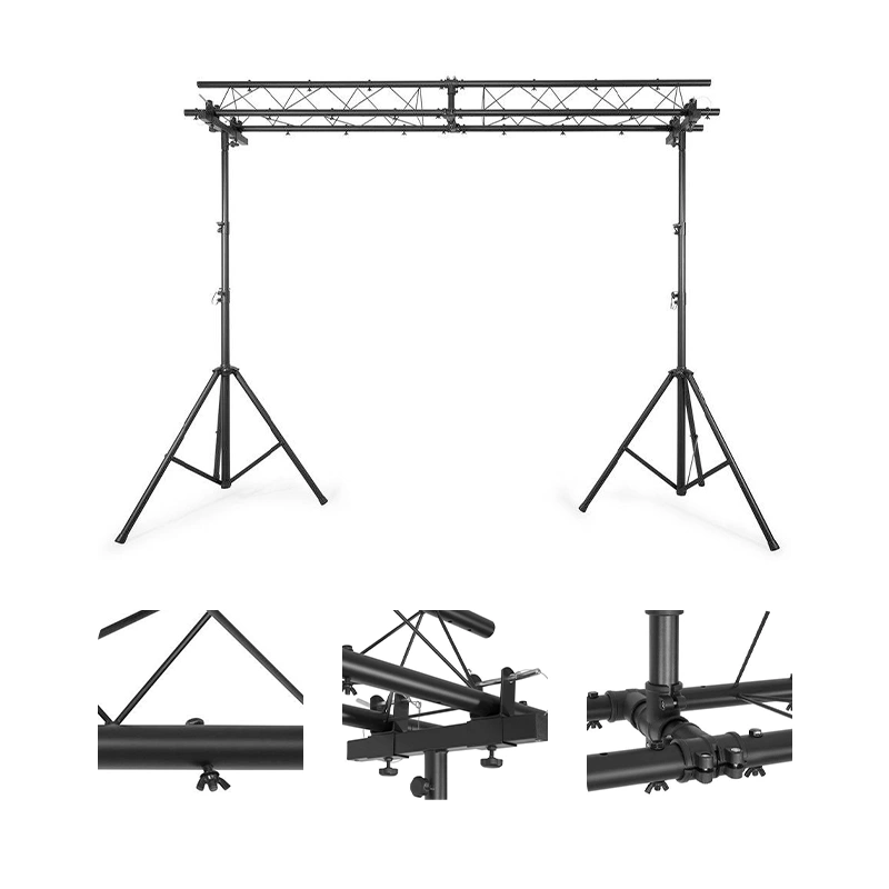 z 2 stojakami jest idealna do zawieszenia do 16 efektów świetlnych. Składa się z 2 części o długości 1,5 metra, które można łatwo połączyć ze sobą, tworząc długość 3 metrów. Dwa statywy o maksymalnej wysokości 3,9 meta zapewniają, że promień z efektami świetlnymi unosi się nad widownią. Cała konstrukcja może wytrzymać rozłożony ciężar do 100kg, co wystarczy na piękny pokaz świetlny z różnymi efektami.