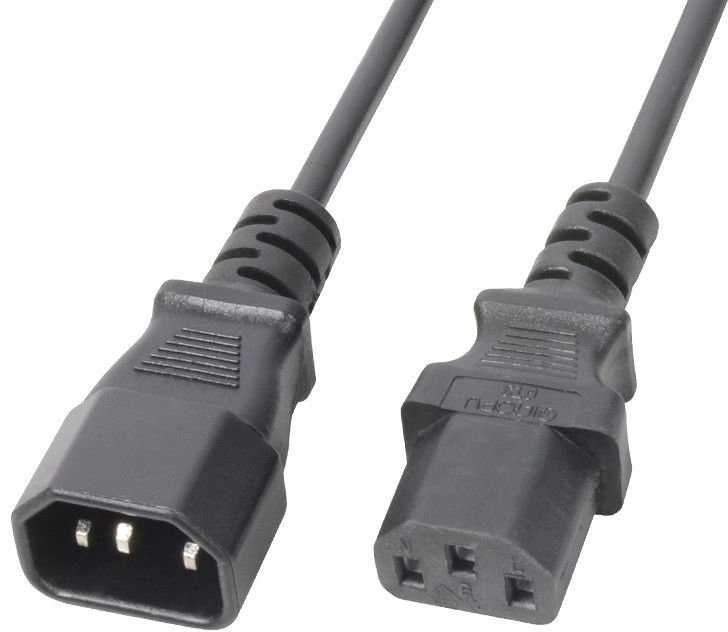 Przedłużacz IEC (IEC C14 wtyk do gniazda IEC C13) / "podaj dalej" marki PD Connex. Może być używany do łańcuchowego łączenia i przekazywania zasilania kolejnym kablom, jednostkom, urządzeniom.