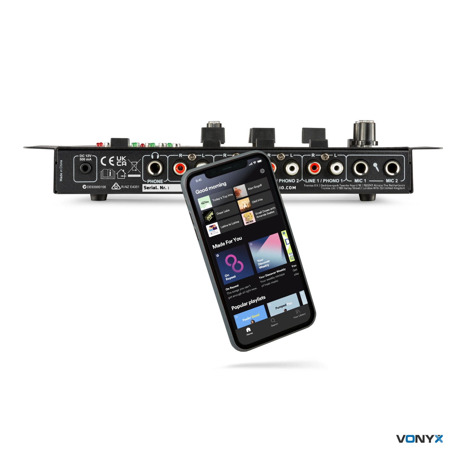 w wiele kanałów i pomimo swoich rozmiarów oferuje 2 wejścia phono (gratis) i 3 wejścia liniowe (do podłączenia zewnętrznych źródeł takich jak telefon, laptop, odtwarzacz CD, tuner itp.). Ponadto STM3030 jest wyposażony we wbudowany odtwarzacz MP3, za pomocą którego można łatwo odtwarzać muzykę z pamięci USB lub karty SD. Wystarczy podłączyć pamięć USB lub kartę SD i gotowe! Ale to nie wszystko, Vonyx STM3030 posiada również odbiornik Bluetooth, za pomocą którego można bezprzewodowo podłączyć telefon, tablet lub laptop, dzięki czemu można bezprzewodowo słuchać ulubionej muzyki za pomocą miksera, idealnie, prawda? A jeśli lubisz tworzyć piękne miksy samodzielnie, możesz również nagrywać własne miksy za pomocą połączenia USB i SD.