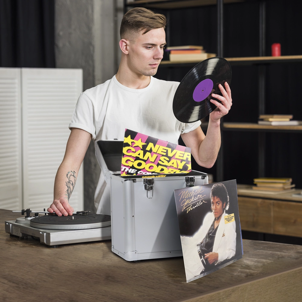teraz z łatwością dzięki temu czarnemu 12-calowemu etui na płyty Power Dynamics RC80, które oferuje miejsce na około 60 płyt (w tym rękaw i wewnętrzną okładkę) z jednym rękawem. Przy podwójnych płytach LP lub zawiniętych rękawach, oczywiście jest mniej miejsca. solidna konstrukcja wytrzymuje uderzenia, a ponieważ wnętrze jest wyłożone pianką, Twoje płyty są całkowicie bezpieczne. Pokrywa jest całkowicie zdejmowana, aby ułatwić dostęp do vinyli. Miękki uchwyt wygodnie leży w dłoni.