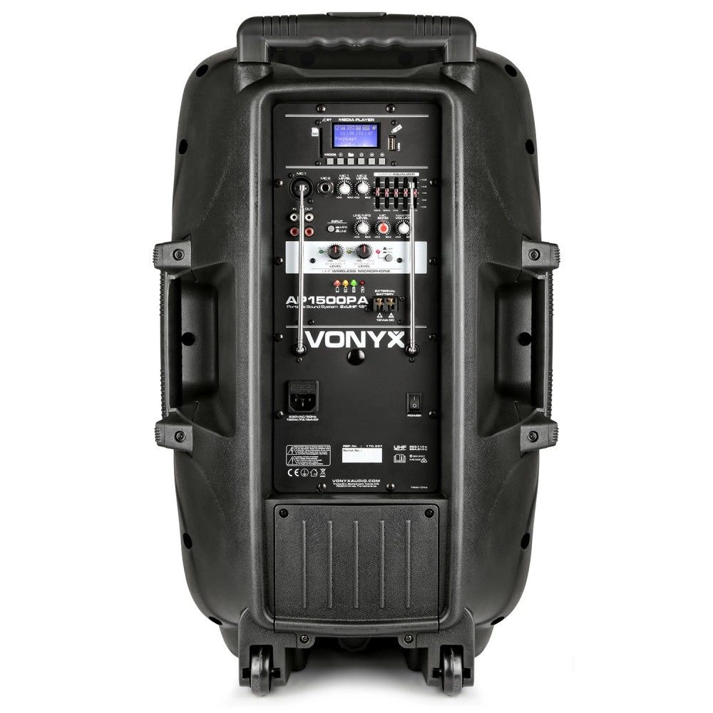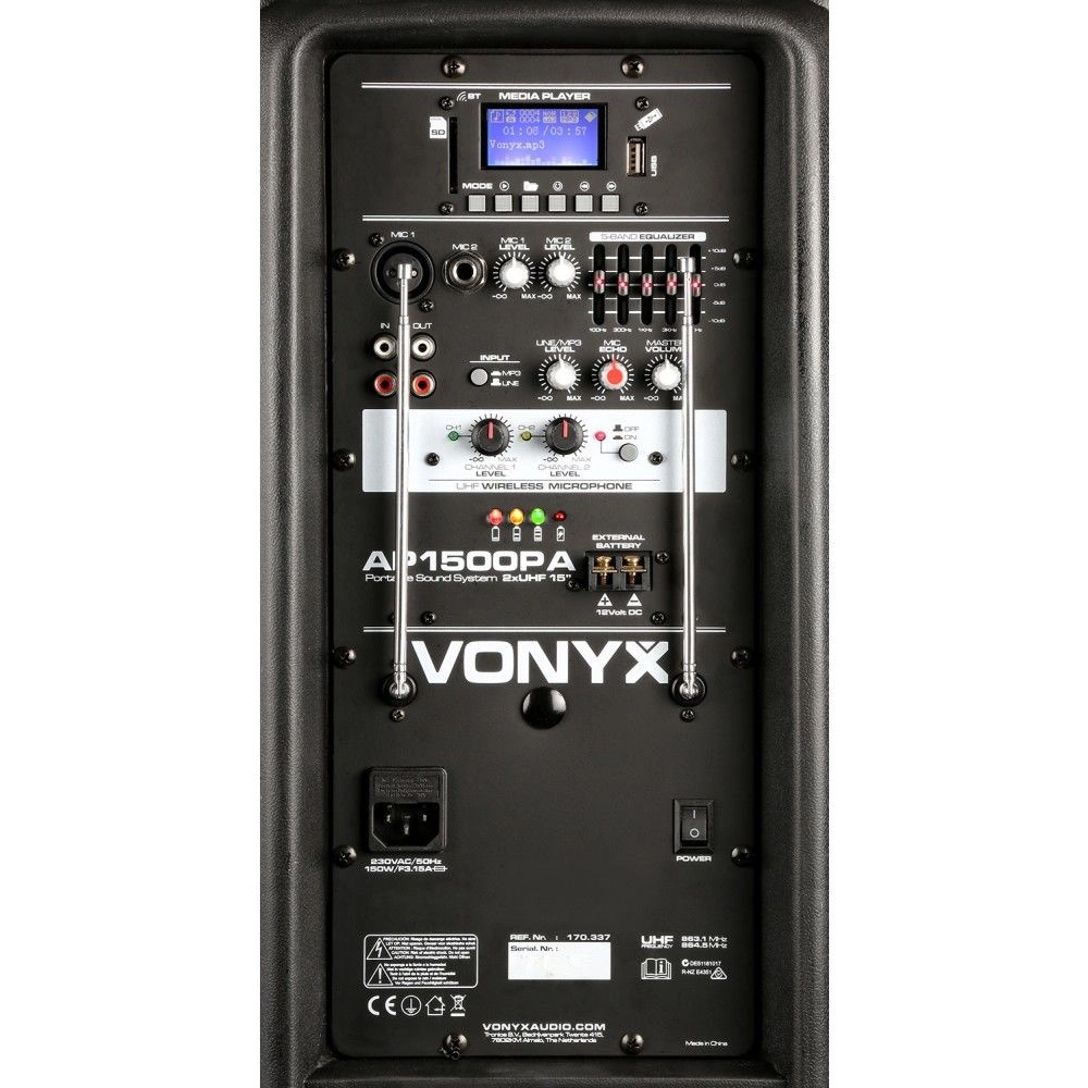 Profesjonalna, kolumna mobilna AP1500PA marki Vonyx o mocy 800W z 15" głośnikiem, pilotem, wbudowanym portem USB oraz SD do odtwarzania plików MP3. System "wszystko w jednym" jest wyposażony w odbiornik Bluetooth oraz dwa bezprzewodowe mikrofony doręczne UHF działające na różnych częstotliwościach. Działa poprzez zasilanie lub wbudowany akumulator 12V wielokrotnego ładowania, dlatego też jest świetnym produktem do zastosowań w plenerze. Wyposażona została w wysuwany uchwyt oraz kółka do łatwiejszego transportu. Z tyłu znajdują się dwa wejścia mikrofonowe z efektem echa, wejście liniowe Aux, panel kontrolny MP3, kontrola tonów. Ten kompletny system jest idealnym rozwiązaniem dla wszystkich, którzy cenią sobie mobilność. Możemy umieścić kolumnę na statywie i ustawić w klubie, pubie, sali sportowej czy szkolnej ale również zabrać ją na imprezę na plaży i praktycznie wszędzie tam gdzie nie ma dostępu do zasilania.