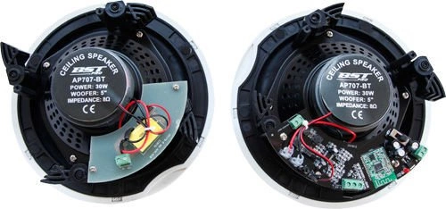 AP707-BT marki Bst to para aktywnych głośników sufitowych, instalacyjnych, składająca się z jednego aktywnego i jednego pasywnego głośnika. Dodatkowo ten zestaw zawiera wbudowany system Bluetooth z oddzielnym włącznikiem. Świetnym ułatwieniem jest wbudowane gniazdo Euroblock i możliwość podłączenia np. laptopa, z którego bezpośrednio można transmitować muzykę. Na bazie tych głośników można zbudować cały system nagłośnienia podłączając pod nie kolejne jednostki. Jest to idealne rozwiązanie do pubów, barów, klubów, restauracji ale również do zastosowań domowych i rozrywkowych.