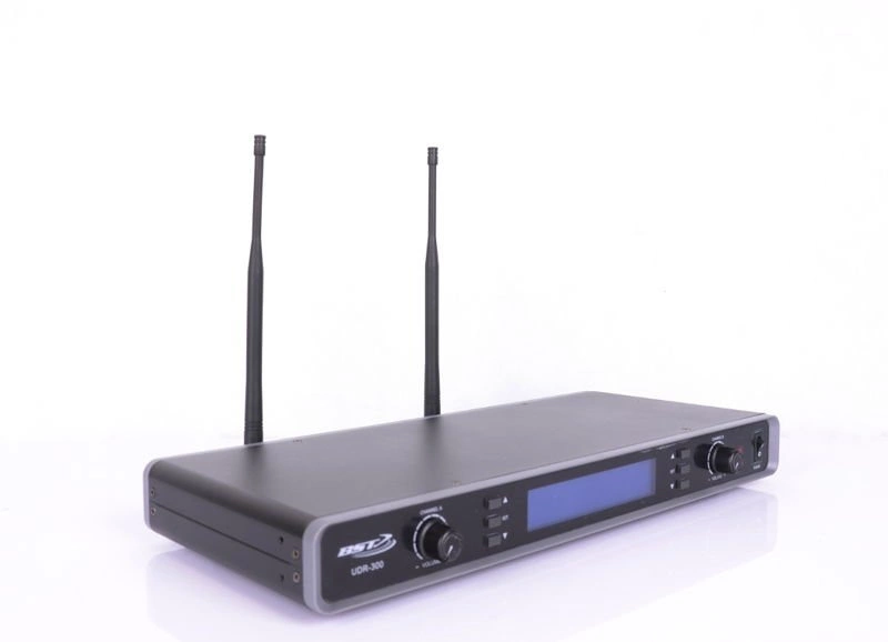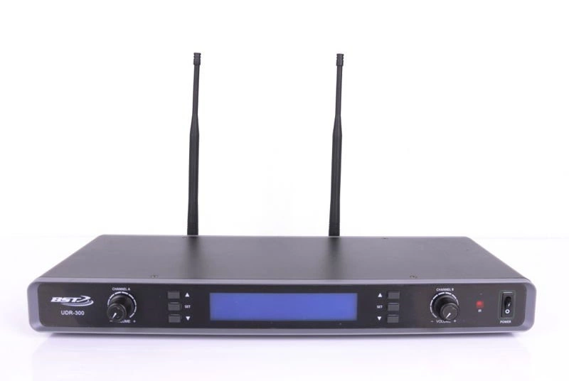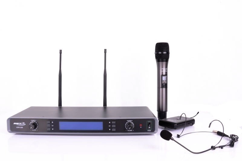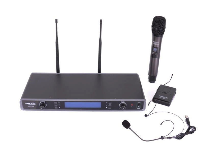 Profesjonalny zestaw bezprzewodowy UDR300 marki BST. Wyposażony został w dwa mikrofony UHF - doręczny i nagłowny, bodypack oraz dwukanałowy odbiornik Taki zestaw umożliwi nagłośnienie małej konferencji czy pokazu, zachowując przy tym doskonałą jakość dźwięku i łatwość funkcjonowania.
