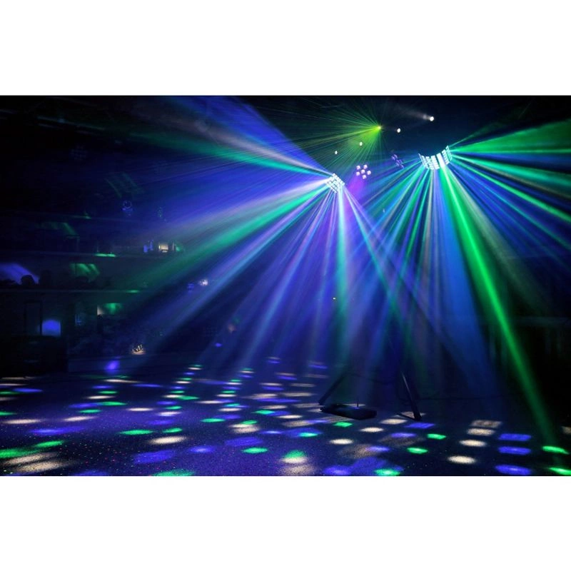 - Dwa duże efekty świetlne Butterfly LED z 48 soczewkami i 4x 3W diodami RGBW LED na efekt