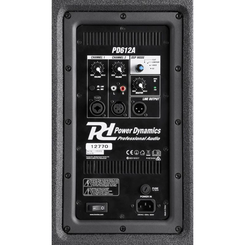 Oznacza to, że głośnik niskotonowy i wysokotonowy są sterowane oddzielnie. Daje to lepszą kontrolę nad głośnikiem niskotonowym i wysokotonowym, co poprawia dźwięk. Wbudowany moduł DSP zapewnia, że ten głośnik brzmi optymalnie w każdym środowisku. Dzięki 4 ustawieniom uzyskasz dźwięk tak, jak chcesz. Wbudowany limiter zapewnia zabezpieczenie przed przesterowaniem i zniekształceniem dźwięku. Pod względem połączeń PD612A jest wyposażony w dwa wejścia liniowe, gdzie możliwe jest nawet podłączenie mikrofonu bezpośrednio na kanale 1. Na przykład PD612A może być również używany do wzmacniania mowy podczas prezentacji i przemówień. Ponadto PD612A jest idealny do użytku przez DJ-ów i innych większych imprez.