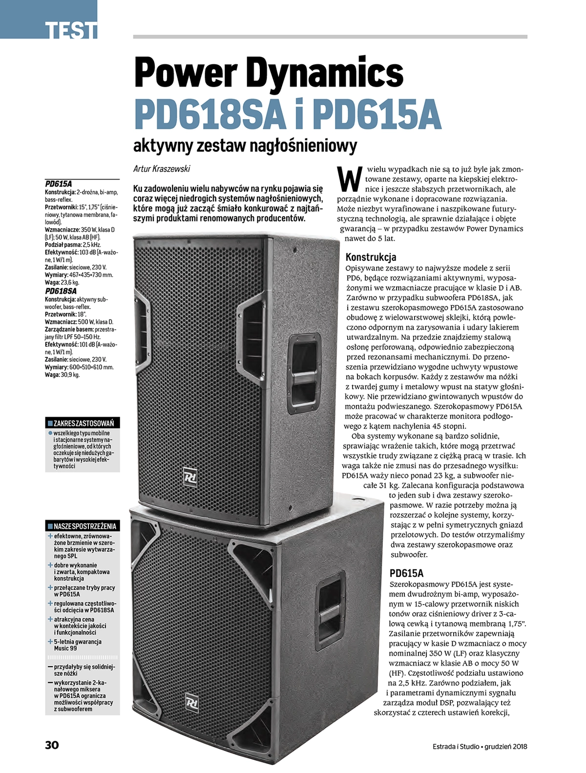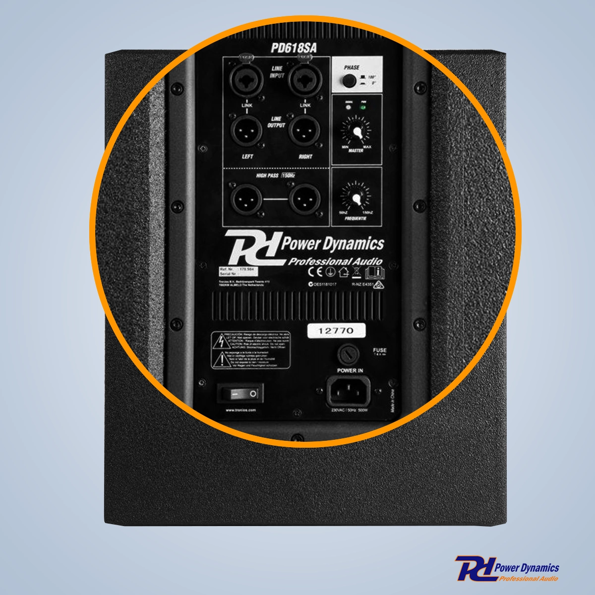 marki Power Dynamics, charakteryzuje się profesjonalnym dźwiękiem i wysoką jakością wykonania. Obudowa stworzona została z odpornej sklejki oraz pomalowanej na czarno obiciowej gumy, która chroni urządzenie przed uszkodzeniami podczas transportu. PD618SA posiada wbudowany crossover do dzielenia tonów sub basu oraz na satelity. Subwoofer został wyposażony w wyjście do podłączenia drugiego suba ale również satelit szerokopasmowych czy wzmacniacza.