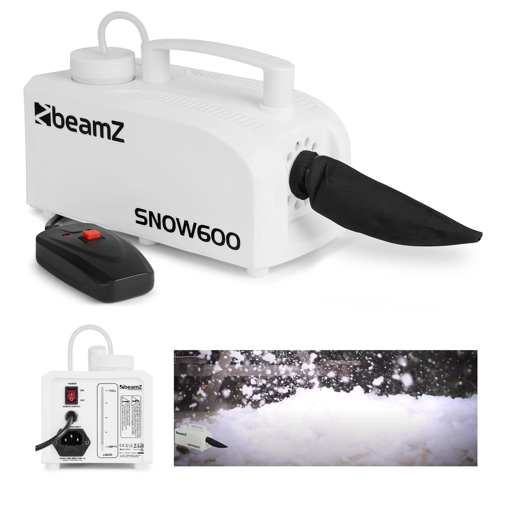 o mocy 600W marki BeamZ. Efektem tego urządzenia nie są klasyczne płatki śniegu, tylko lekko unosząca się, zwiewna piana, ale nie tak skumulowana jak w klasycznych maszynach do piany. Pianka długo utrzymuje się w miejscu gdzie opadnie, płaszczyzna nie robi się bardzo mokra i przy zastosowaniu dedykowanych płynów nie pozostawia plam. Zestaw zawiera pilota na 5m kablu, który umożliwia swobodne sterowanie maszyną z dogodnej odległości. Dzięki tej wytwornicy, niezależnie od pory roku uzyskamy niesamowity zimowy efekt z wirującymi dookoła płatkami śniegu. Idealna propozycja na niezapomniane imprezy, do klubów, na pokazy czy koncerty. Idealny do symulacji śniegu na przykład w szopce bożonarodzeniowej lub w schronisku narciarskim, klubie lub barze. SNOW600 może być również doskonale używany podczas przyjęć domowych, aby stworzyć przytulną zimową atmosferę.