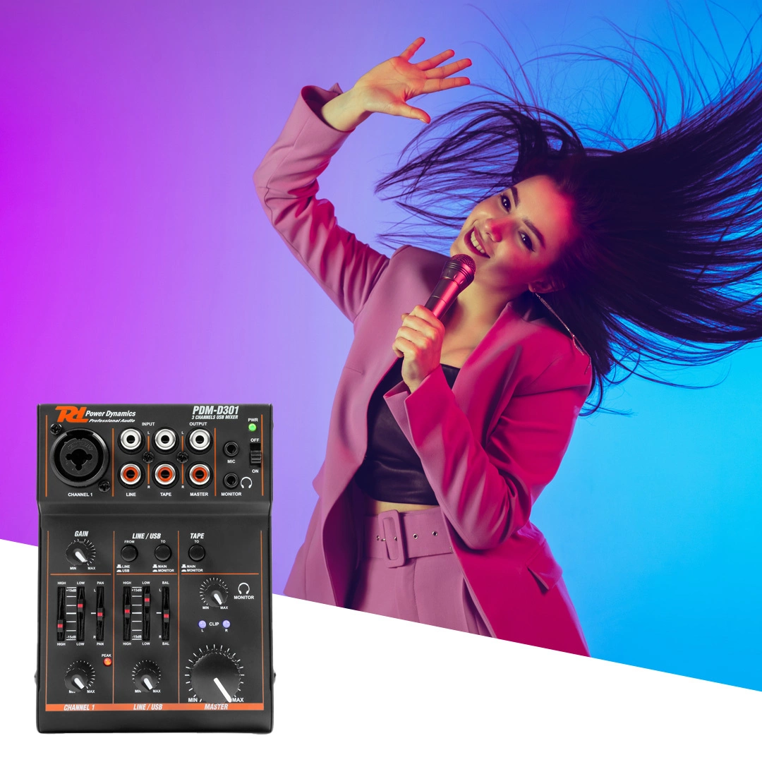Kompaktowy mikser do zastosowań na małą skalę. Mikser ma jedno wejście mono i jedno wejście stereo, dzięki czemu ten mikser idealnie nadaje się do korzystania ze standardowego systemu dźwiękowego do odtwarzania muzyki i mowy (mikrofon). PDM-D301 posiada 2-pasmowy korektor do regulacji tonów wysokich i niskich. Mikser jest wyposażony w złącze USB do podłączenia do laptopa lub komputera. Mikser jest również zasilany przez to złącze USB.