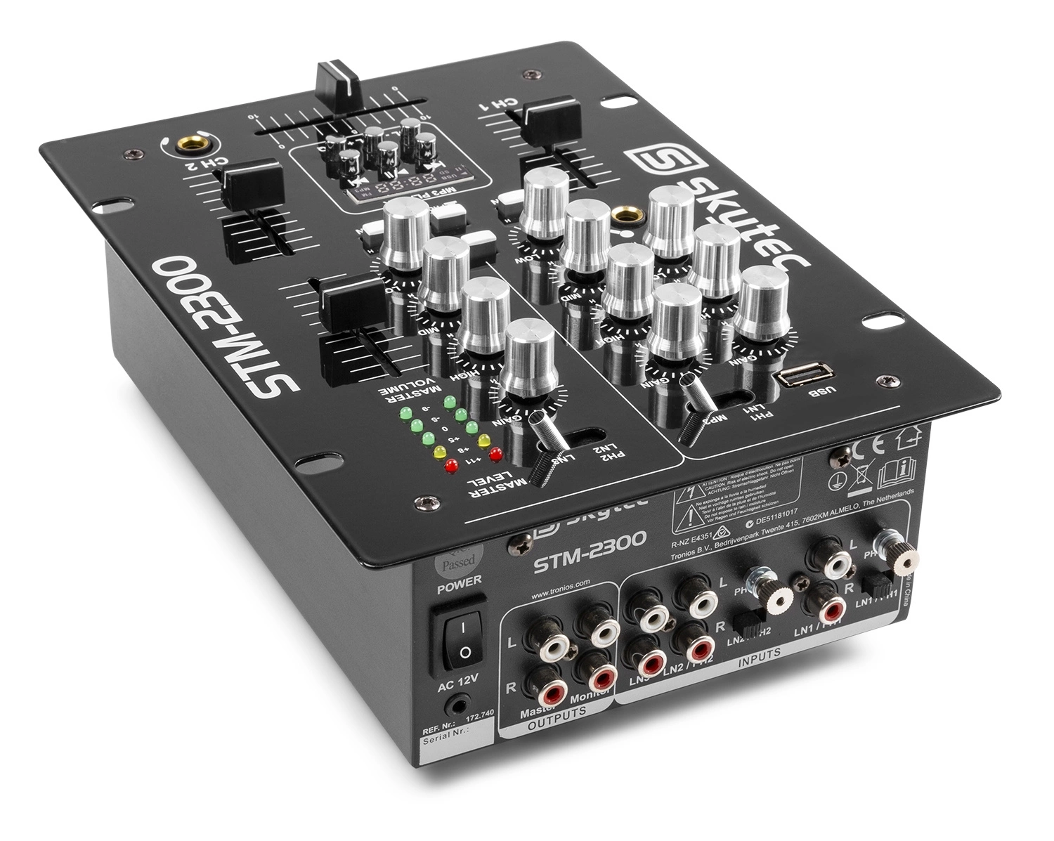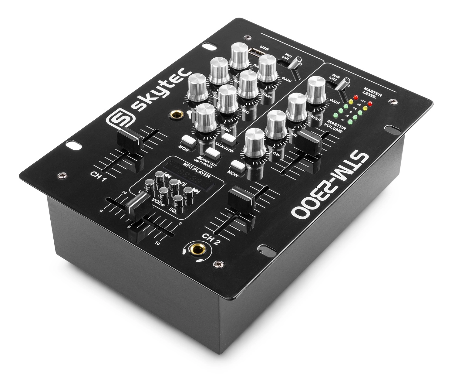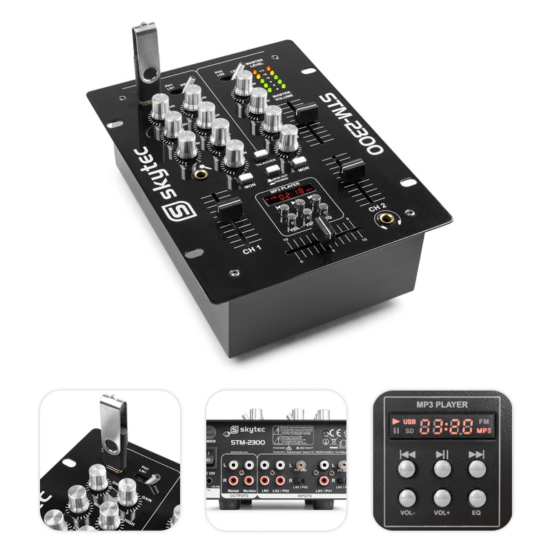 SkyTec STM-2300 jest 2-kanałowym mikserem z możliwością bezpośredniego odtwarzania plików MP3 poprzez port USB