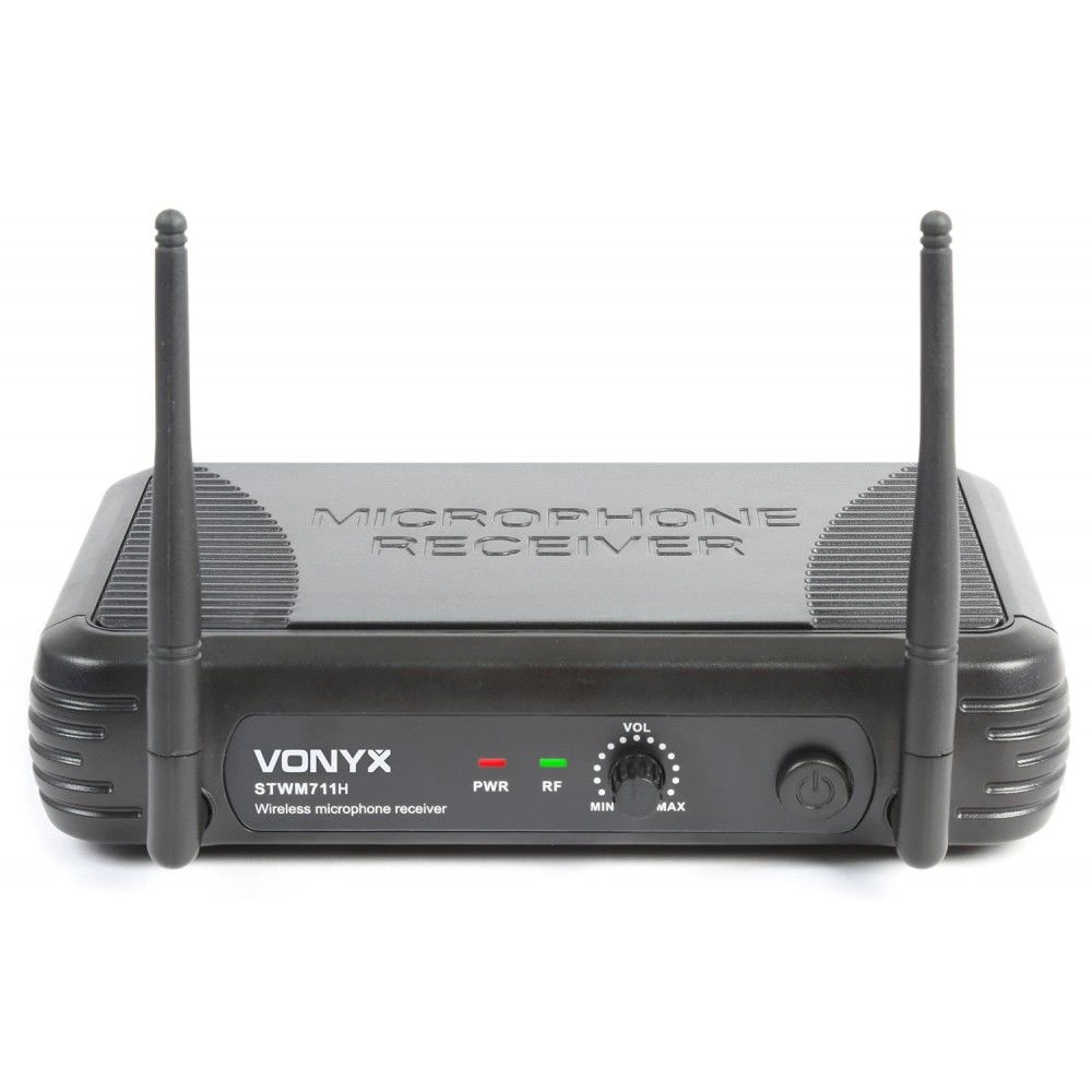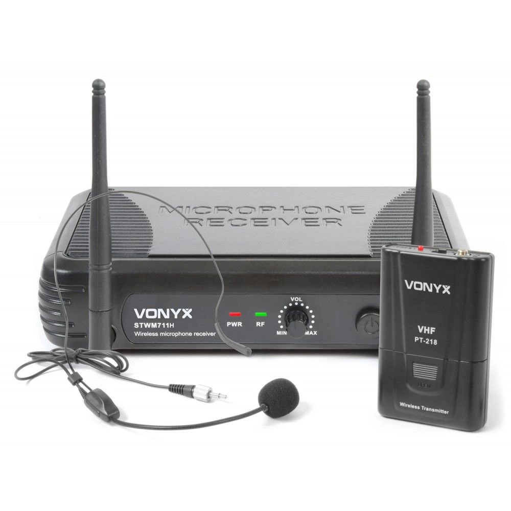 Bezprzewodowy mikrofon nagłowny Vonyx STWM711H VHF to system z pojedynczym mikrofonem nagłownym. System jest dostarczany w komplecie, w tym kabel jack 6,3 mm do podłączenia odbiornika do systemu dźwiękowego. W razie potrzeby odbiornik można również podłączyć w sposób zbalansowany przez złącze XLR.