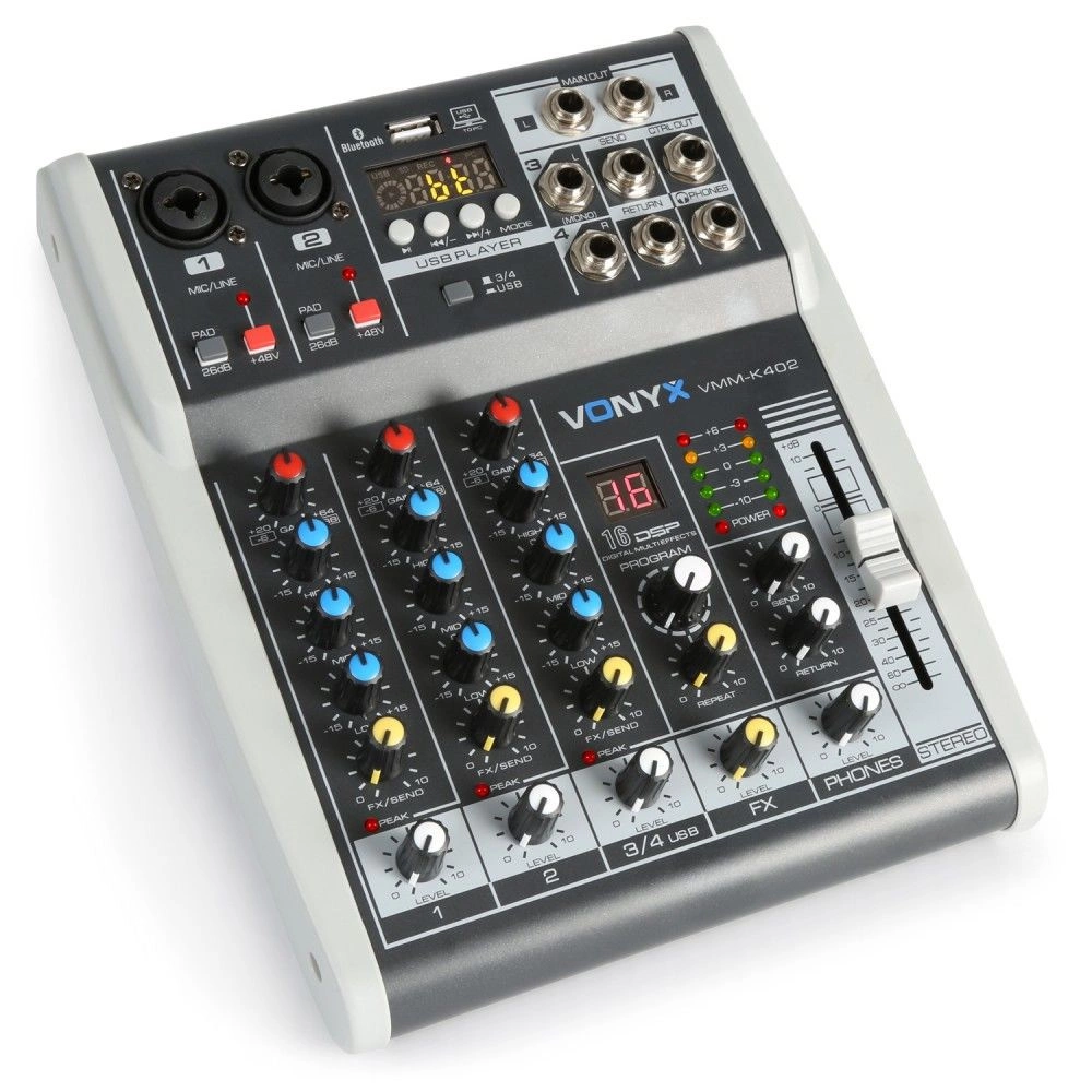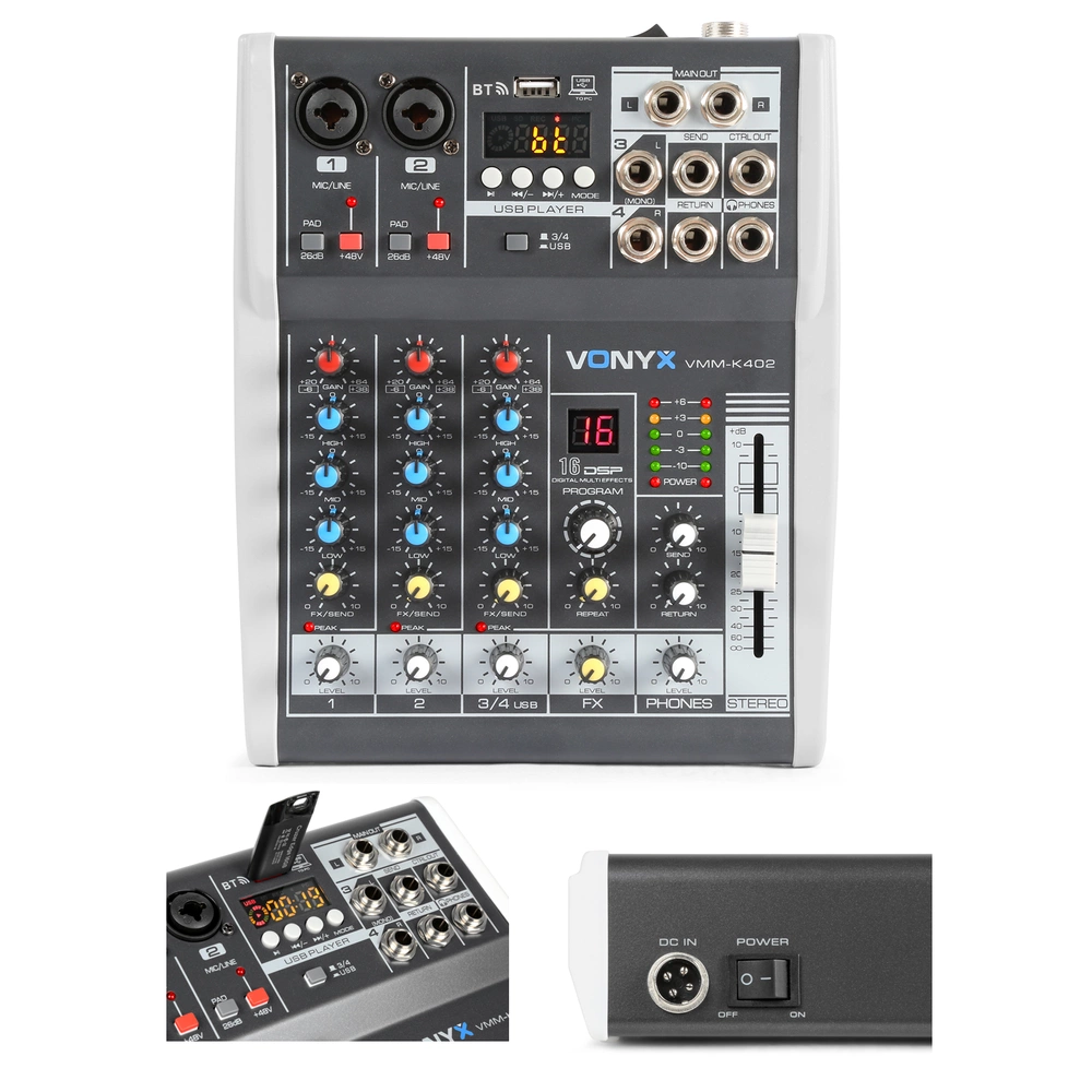 Pomimo niewielkich rozmiarów VMM/K402 oferuje sporo opcji. Pierwsze dwa kanały można wykorzystać do podłączenia mikrofonu lub innego źródła dźwięku (wejście liniowe). Aby umożliwić korzystanie z często lepszych mikrofonów pojemnościowych, kanały te są wyposażone w przełączane zasilanie fantomowe (+48V). 3-pasmowy korektor umożliwia regulację wysokich, średnich i niskich tonów dla tych kanałów w celu idealnego dopasowania wszystkich kanałów. Kanały 3 i 4 zostały połączone w kanał stereo z wieloma opcjami. Mikser ma wbudowany moduł interfejsu bluetooth, MP3 i PC, pozwala to na nawiązanie bezprzewodowego połączenia przez Bluetooth, na przykład z telefonem lub tabletem. Inną możliwością jest włożenie pendrive'a z muzyką mp3, wewnętrzny odtwarzacz MP3 odtwarza muzykę bezpośrednio z pamięci USB. Interfejs PC umożliwia podłączenie miksera do komputera za pomocą kabla USB (w zestawie). Mikser jest wtedy postrzegany jako karta dźwiękowa, po czym muzyka odtwarzana na komputerze może być słyszana przez połączenie USB na kanale 3/4. I odwrotnie, możliwe jest również nagrywanie końcowego miksu miksera za pomocą komputera. Ostatnią opcją dla kanałów 3/4 jest wejście liniowe. Za pomocą przełącznika możesz zdecydować, aby nie używać jednostki wewnętrznej i korzystać z zewnętrznego źródła dźwięku przez kanał 3/4.