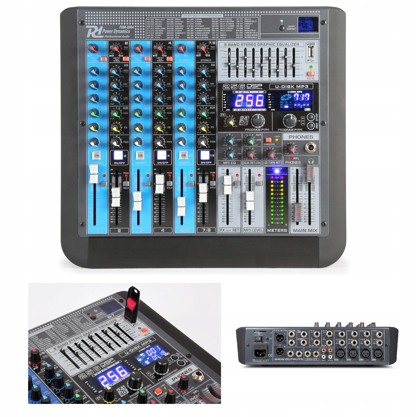 Power Dynamics PDM-S804 to kompaktowy, profesjonalny 8-kanałowy mikser pełen możliwości. Bluetooth, odtwarzacz MP3 USB, DSP z 256 efektami, korektory. PDM-S804 jest idealnym wyborem dla mniejszych zespołów, duetów śpiewających, piosenkarzy- tekściarzy, artystów itp. Ten mikser jest również idealnym wyborem dla małych studiów. Pomimo wielu opcji i możliwości jest przejrzysty i łatwy w obsłudze, dzięki czemu bezproblemowa obsługa nie wymaga wprawy.
