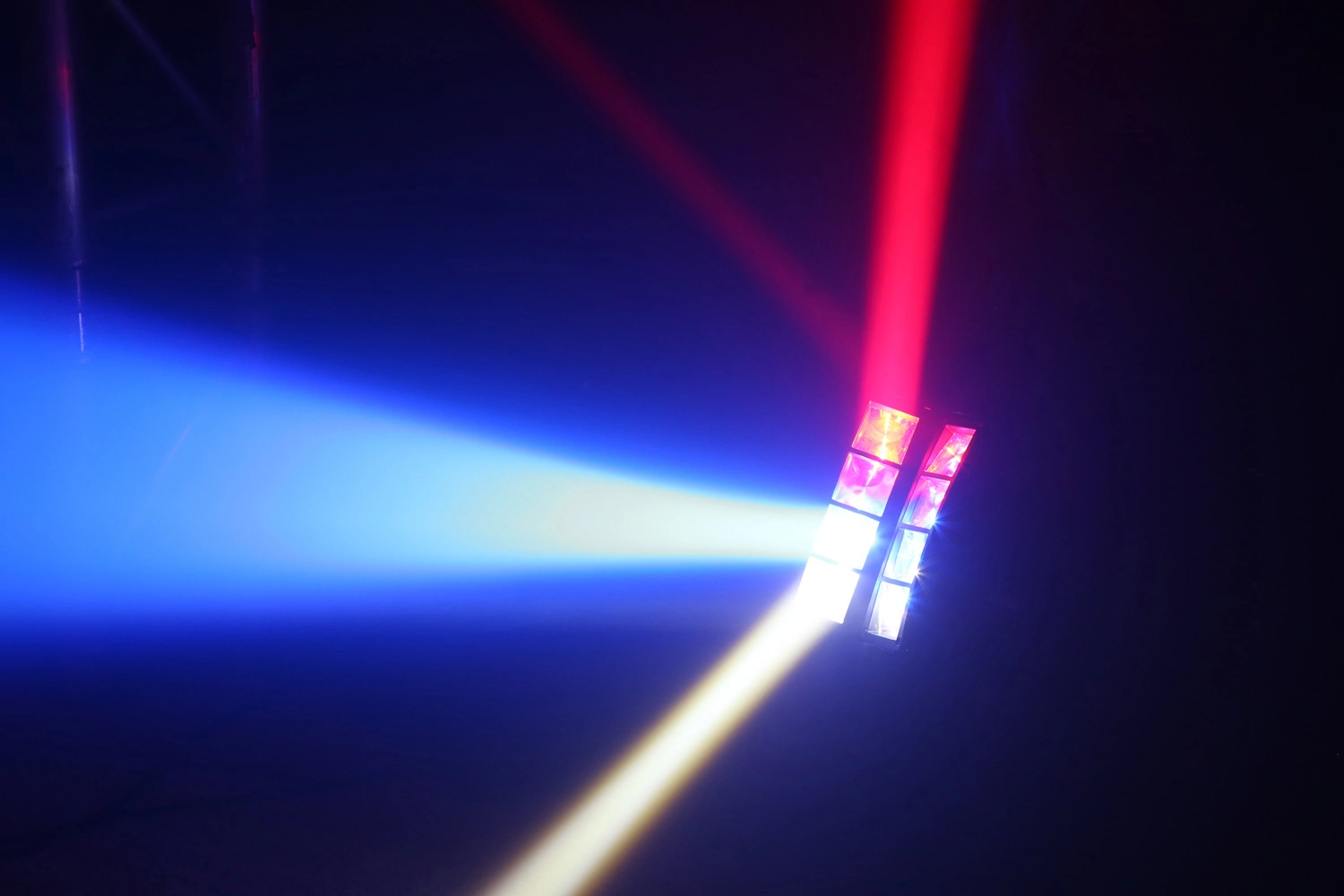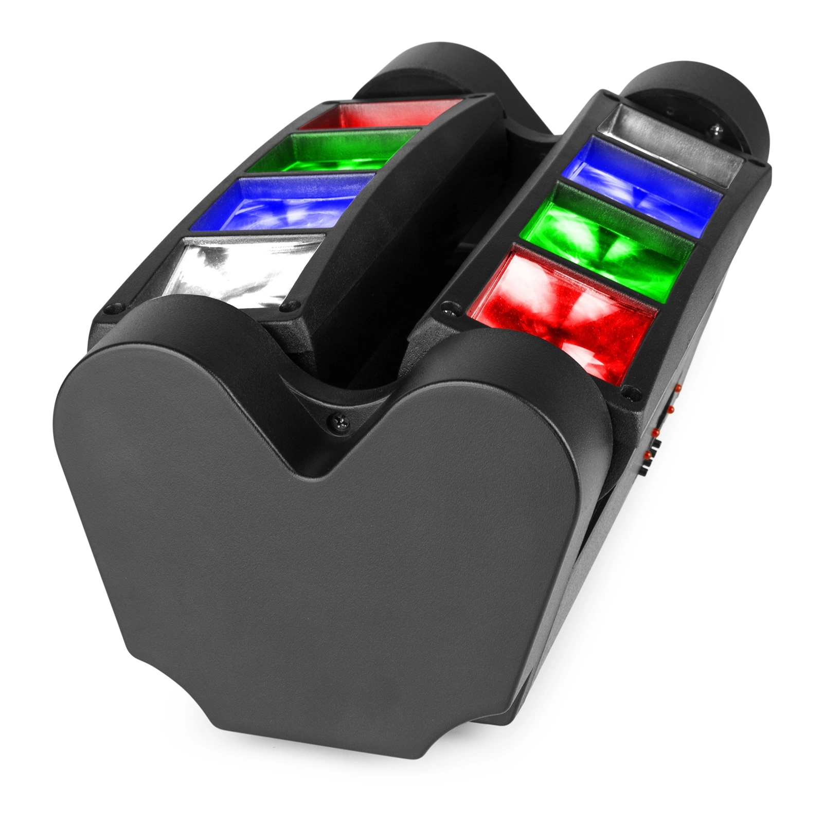 Wspaniały i popularny efekt świetlny o szerokim rozkładzie. Efekt świetlny składa się z dwóch pasków po cztery soczewki, które mogą poruszać się niezależnie od siebie. Na każdym znajdują się cztery diody CREE LED o mocy 3W na diodę LED. Te diody LED mają kolory czerwony, zielony, niebieski i biały. Ponieważ dwa paski i diody LED mogą być obsługiwane całkowicie niezależnie od siebie, możliwe jest stworzenie bardzo pięknego, ruchomego i kolorowego pokazu świetlnego.