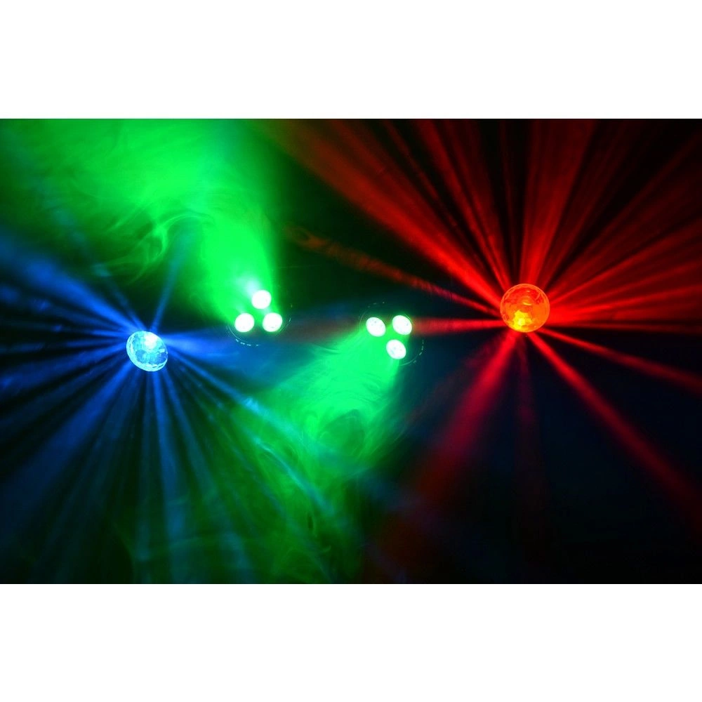 Oba Jellymoons zapewniają przyjemny efekt ruchu. Wielokolorowe wiązki poruszają się po pokoju i tworzą fantastyczny efekt. Ten poruszający efekt, wraz z kolorowym oświetleniem z obu punktów PAR, tworzy kompletny pokaz świetlny.