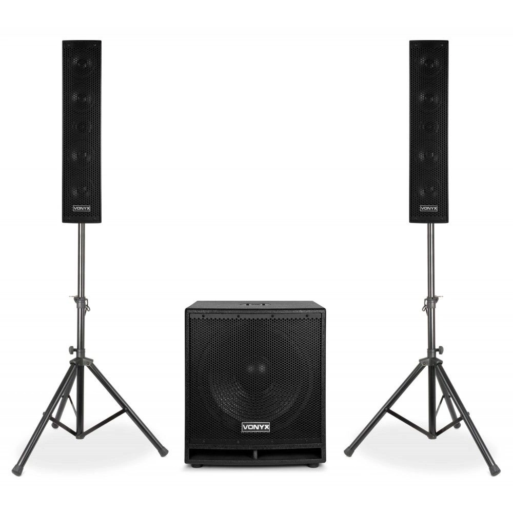 Bardzo ładny aktywny zestaw 2.1 składający się z 15'' subwoofera z wbudowanym wzmacniaczem i dwóch satelit z 4x 2,5" średniotonowym i 1x 2,5" tweeterem. Zestaw jest dostarczany w komplecie z dwoma statywami, dwoma 5-metrowymi kablami głośnikowymi i ręcznym mikrofonem. Dzięki wbudowanemu modułowi Bluetooth zestaw ten jest od razu gotowy do użycia np. z telefonem lub tabletem. Oczywiście możliwe jest podłączenie zewnętrznego źródła takiego jak mikser, odtwarzacz CD itp. poprzez wejście RCA.