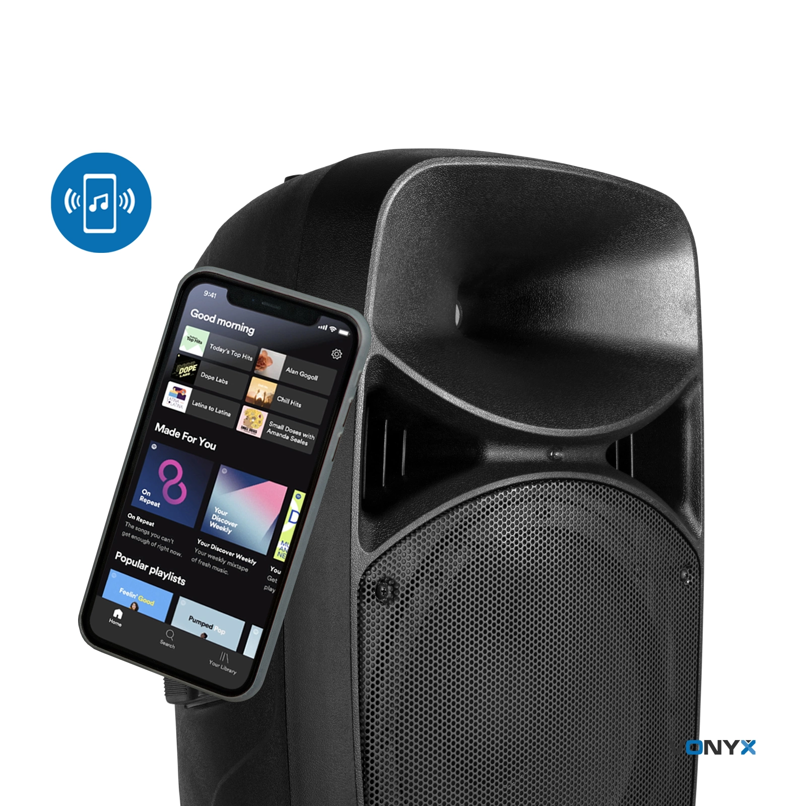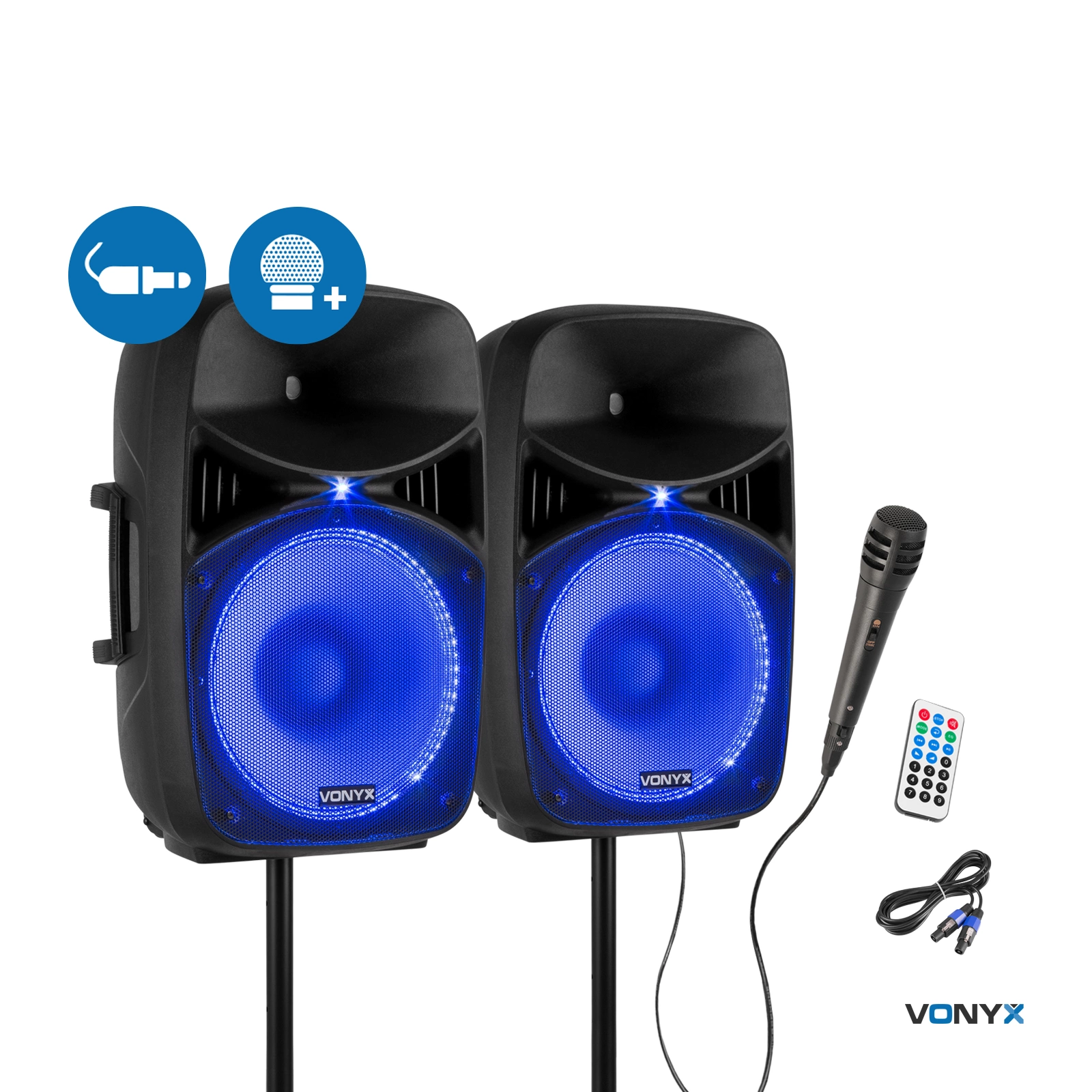 W zestawie statywy i poręczny pilot. Oba głośniki są wyposażone w okrągły pierścień LED wokół obu głośników niskotonowych z niebieskimi diodami LED. Te diody LED reagują na muzykę, ale w razie potrzeby można je również wyłączyć. W zestawie znajduje się ręczny mikrofon do wygłaszania przemówień lub do zaprezentowania swojego talentu wokalnego. Istnieje kilka opcji odtwarzania muzyki, takich jak Bluetooth, odtwarzacz USB/SD MP3 oraz wejście liniowe/AUX. Dostępny jest 5-pasmowy korektor do precyzyjnego dostrajania dźwięku.