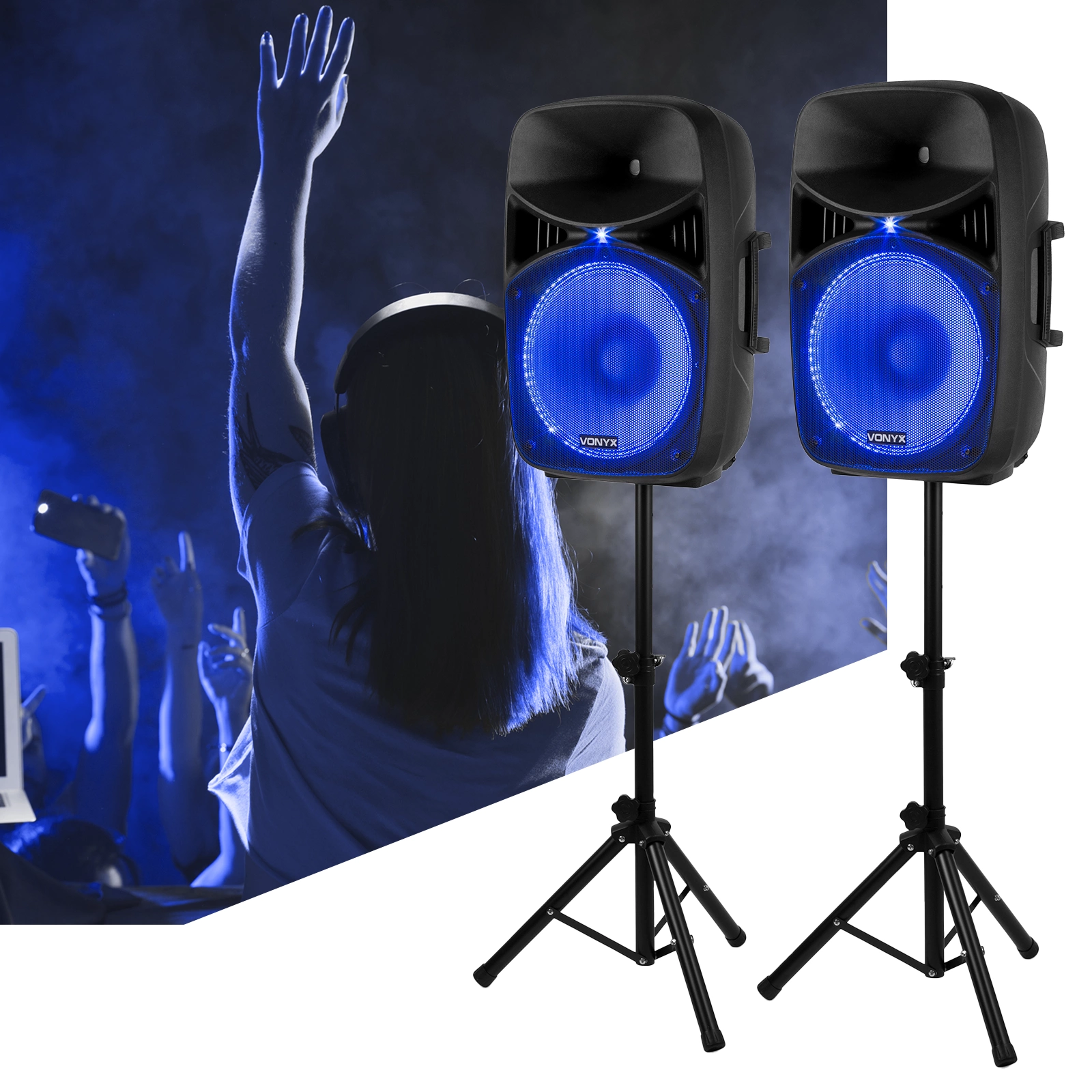 Vonyx VPS152A jest idealny do użytku tymczasowego lub mobilnego, częściowo dzięki dołączonym statywom. Cały zestaw można szybko oddać do użytku i równie szybko przechowywać.