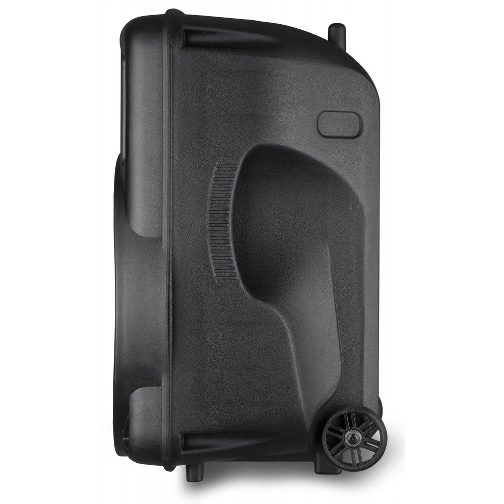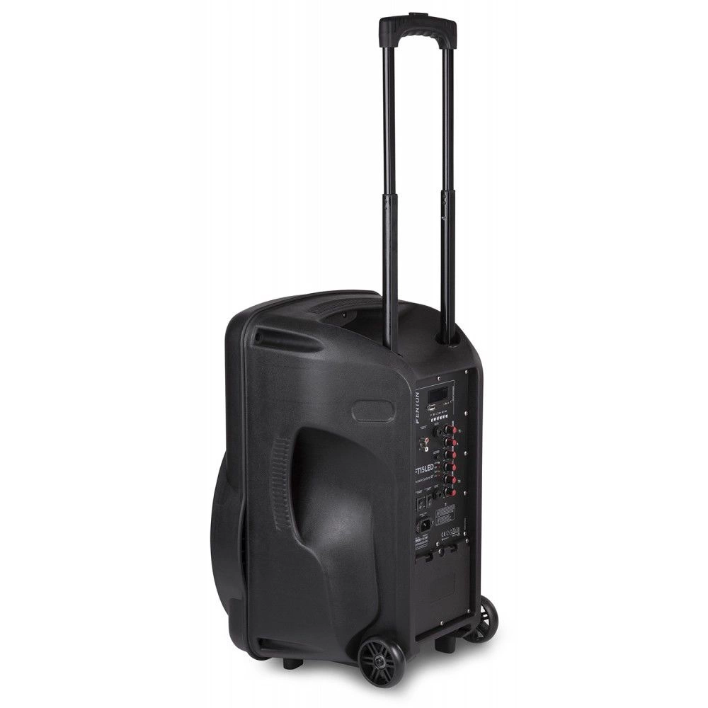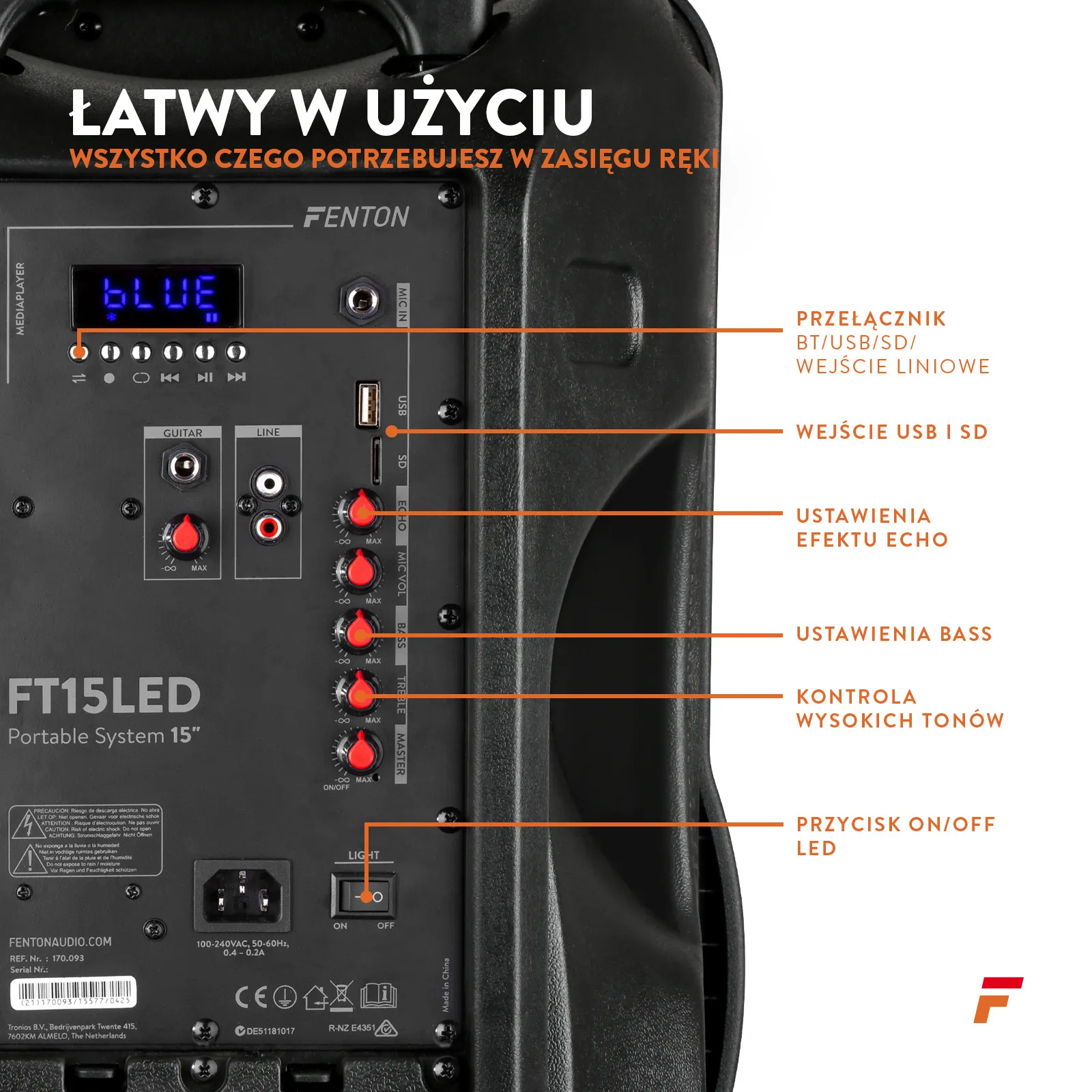 Przenośna kolumna Fenton FT15LED o mocy 800W, pozwala urządzić wspaniałe przyjęcie. Dzięki wbudowanemu akumulatorowi, kolumny FT15LED można używać w dowolnym miejscu, bez konieczności szukania gniazdka elektrycznego. FT15LED wyposażony jest w 15-calowy głośnik niskotonowy, oraz diody LED z funkcją włącz/ wyłącz. Efekty świetlne, oraz odpowiednia jakość dźwięku w kolumnie Fenton zapewnią wiele godzin doskonałej zabawy. Dodatkowym atutem kolumny jest dołączony do zestawu bezprzewodowy mikrofon z efektem echa, który idealnie sprawdzi się na imprezy typu Karaoke, wieczór panieński czy kawalerski. FT15LED ma również wejście instrumentalne, które daje możliwość podłączenia na przykład gitary.