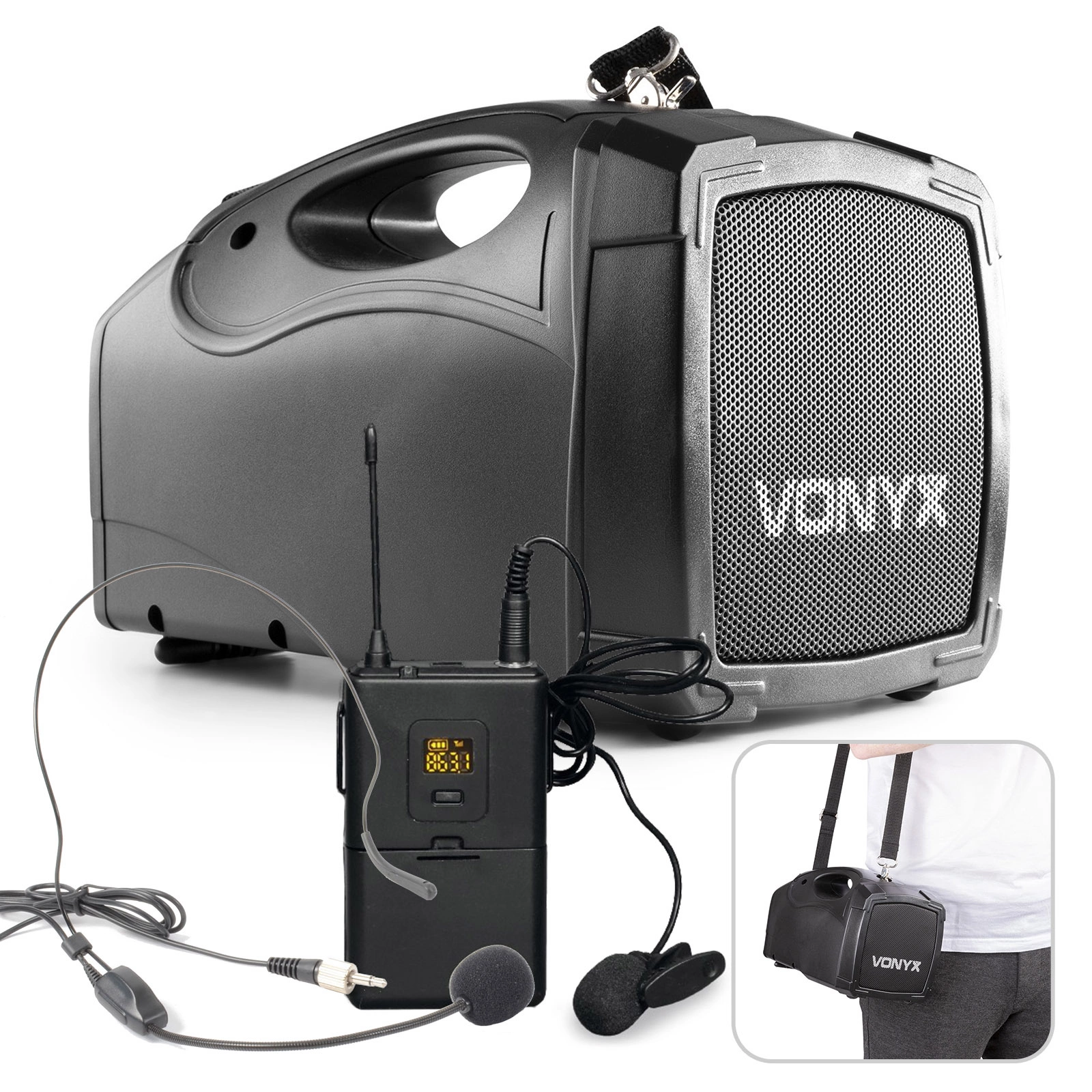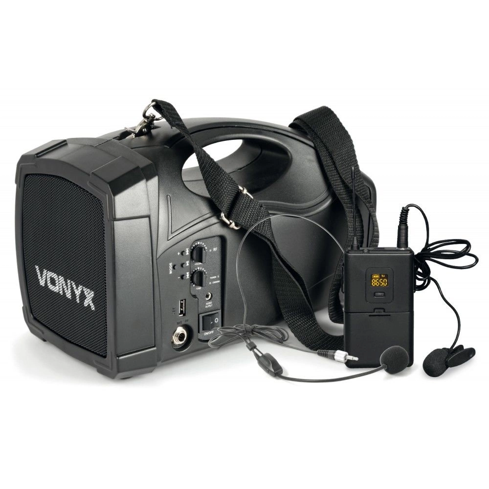 do zastosowań wewnątrz jak i na zewnątrz takich jak konferencje, promocje sprzedaży dla przewodnika etc. Wszędzie gdzie trzeba przemówić do publiczności. Zestaw składa się z głośnika przenośnego, bezprzewodowego bodypacka UHF z mikrofonem nagłownym oraz krawatowym.