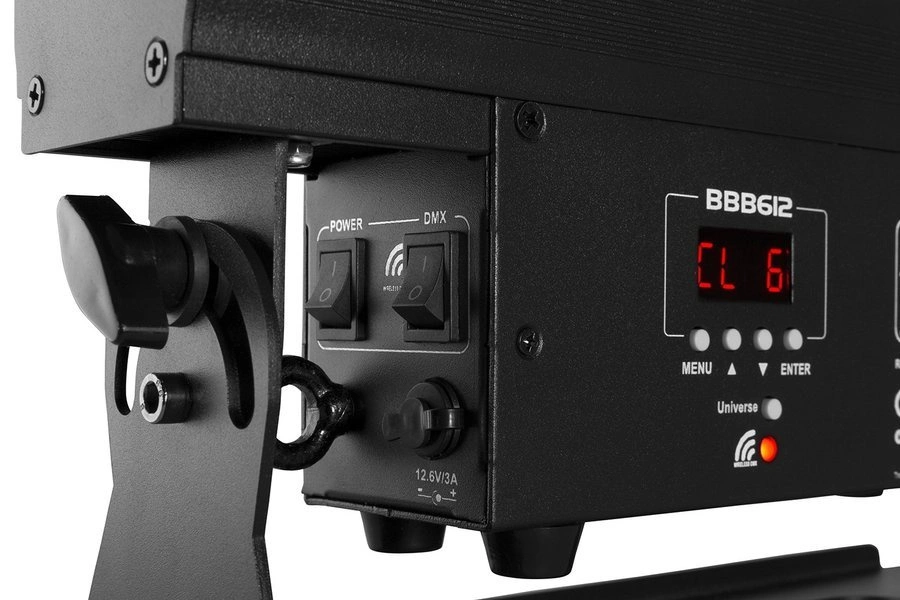 Pełne naładowanie akumulatora wynosi 5h, a użytkowanie urządzenia nawet do 20 godzin pracy. BBB612 wyposażony jest w 6 diod LED o mocy 12W na LED. W przypadku oświetlenia LED jest to bardzo duża moc, dzięki czemu lampa BBB916 jest w stanie uzyskać bardzo wysoką wydajność świetlną. Każda dioda LED ma kolor czerwony, zielony, niebieski, bursztynowy i biały + UV (RGBAW-UV), dzięki czemu ścianę lub obiekt można oświetlić w dowolnym kolorze za pomocą mieszania kolorów.
