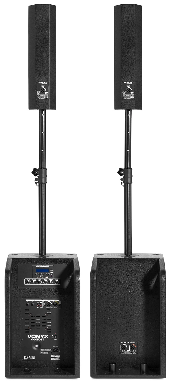 Vonyx VX1050BT to aktywny system dźwiękowy Bluetooth 1150W, z którego można korzystać natychmiast po otrzymaniu. Zestaw składa się z dwóch 12" subwooferów, z których jeden jest aktywny, zestawu topów z 3x 4,5" średniotonowym i 1x 2,5" tweeterem, mikrofonem, słupkami pośrednimi i wszystkimi niezbędnymi kablami do połączenia wszystkiego ze sobą. Zestaw jest szybki i łatwy w montażu , posiada moc 1150W, dzięki czemu idealnie nadaje się na wszelkie imprezy.