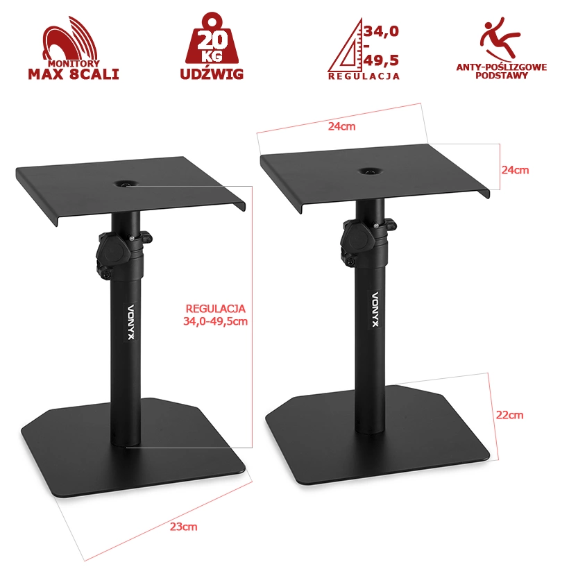 Przeznaczone są do ustawienia na biurku, stole lub szafce. Posiadają możliwość regulacji wysokości pomiędzy 34cm, a 49cm. Posiadają dodatkowo antypoślizgowe zabezpieczenia góry oraz nóżek.