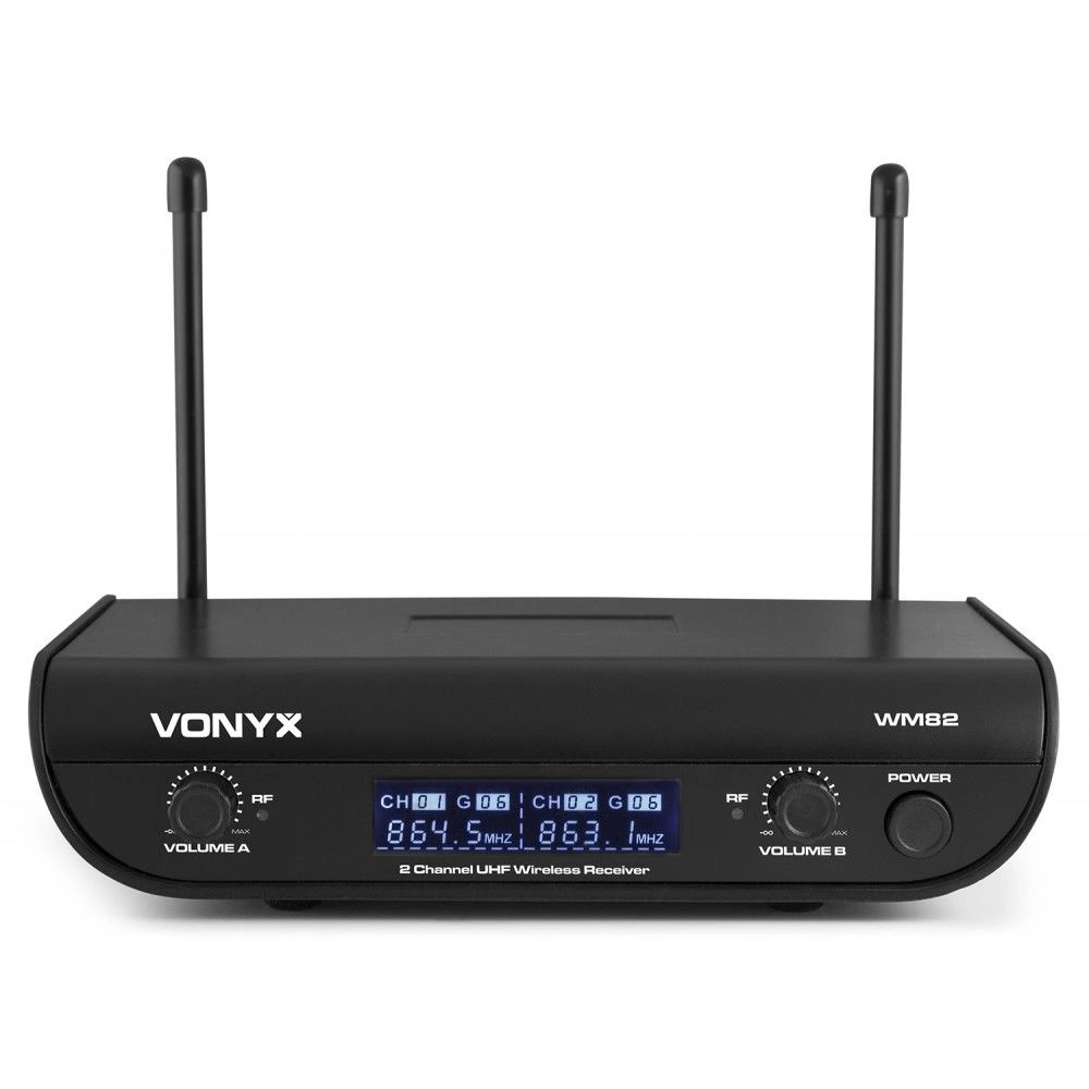 Vonyx WM82 to zestaw mikrofonów bezprzewodowych z dwoma ręcznymi mikrofonami UHF. Dzięki zastosowaniu stałej częstotliwości mikrofony nie muszą być programowane w odbiorniku, dzięki czemu zestaw jest szybki i przede wszystkim bardzo łatwy w użyciu. Podłącz odbiornik do nagłośnienia, włóż baterie do mikrofonów i zestaw jest gotowy do użycia. Wyświetlacz na mikrofonach jest wyposażony we wskaźnik baterii, dzięki czemu niespodziewane wyczerpanie baterii to już przeszłość. Dzięki częstotliwościom UHF WM82 gwarantuje niezawodną i dobrą transmisję sygnału. WM82 może być używany do mowy i do (półprofesjonalnego) śpiewu.