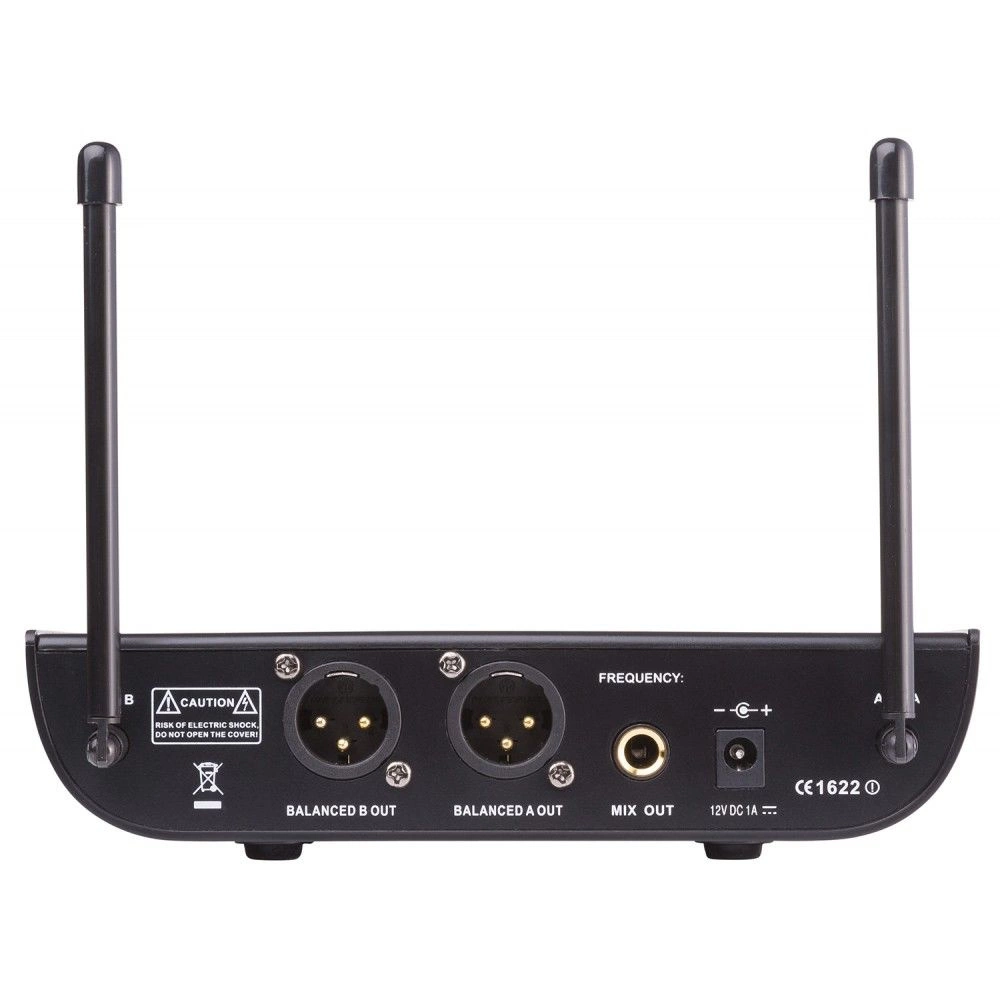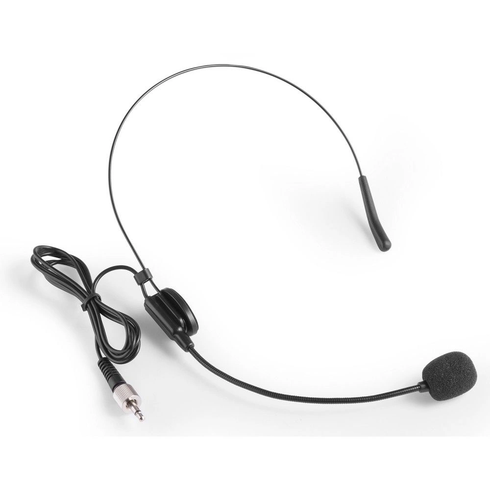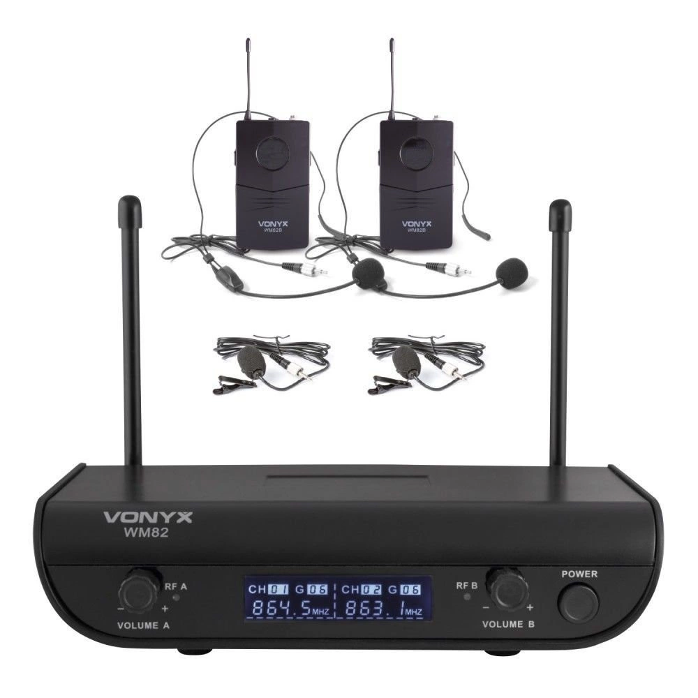 to 2-kanałowy system mikrofonów bezprzewodowych UHF o stałej częstotliwości, w tym dwa bodypacki, dwa mikrofony nagłowne i dwa mikrofony typu tie-clip, krawatowe. W idealnych warunkach można uzyskać zasięg 50 m lub więcej.