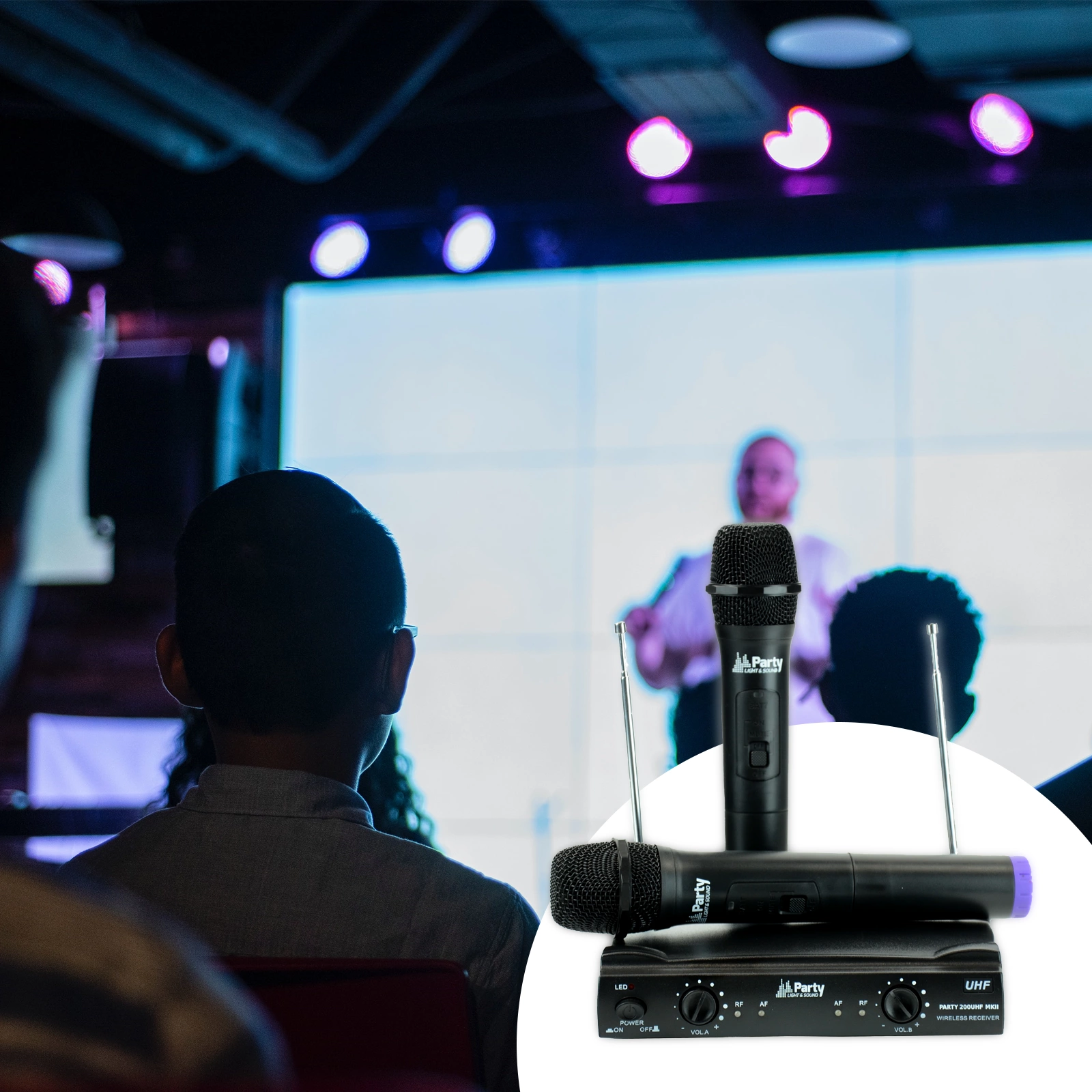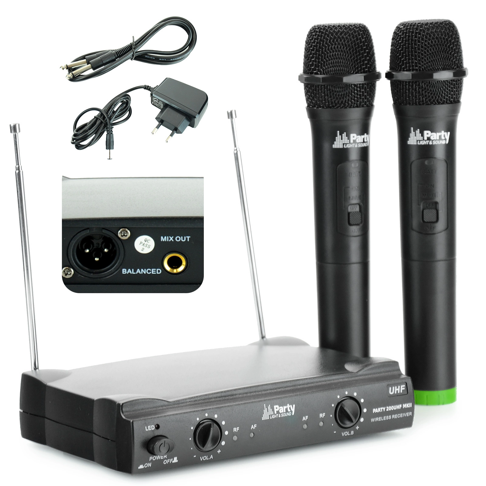 Bezprzewodowy system mikrofonowy UHF składający się z dwóch mikrofonów ręcznych ze zintegrowanymi nadajnikami oraz dwukanałowego odbiornika.