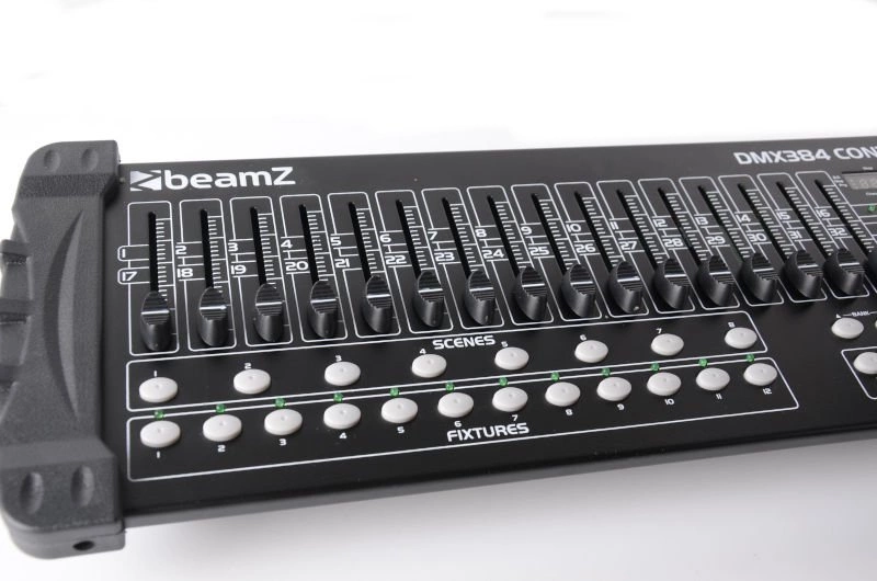 do sterowania efektami świetlnymi, takimi jak ruchome głowy i lasery. Za pomocą kontrolera można sterować 12 efektami, z maks. 32 kanałami na efekt. Pełną kontrolę nad połączonymi efektami uzyskuje się za pomocą 16 suwaków. Każdy suwak obsługuje 2 kanały. Pierwszy suwak odpowiada kanałowi 1 i 17, drugi suwakowi kanałowi 2 i 18 itd. Za pomocą prostego naciśnięcia przycisku możesz łatwo i szybko wybrać kanał efektu, którym chcesz sterować. Dzięki poręcznemu oświetleniu, możesz również znaleźć drogę na BeamZ DMX384 w ciemności.