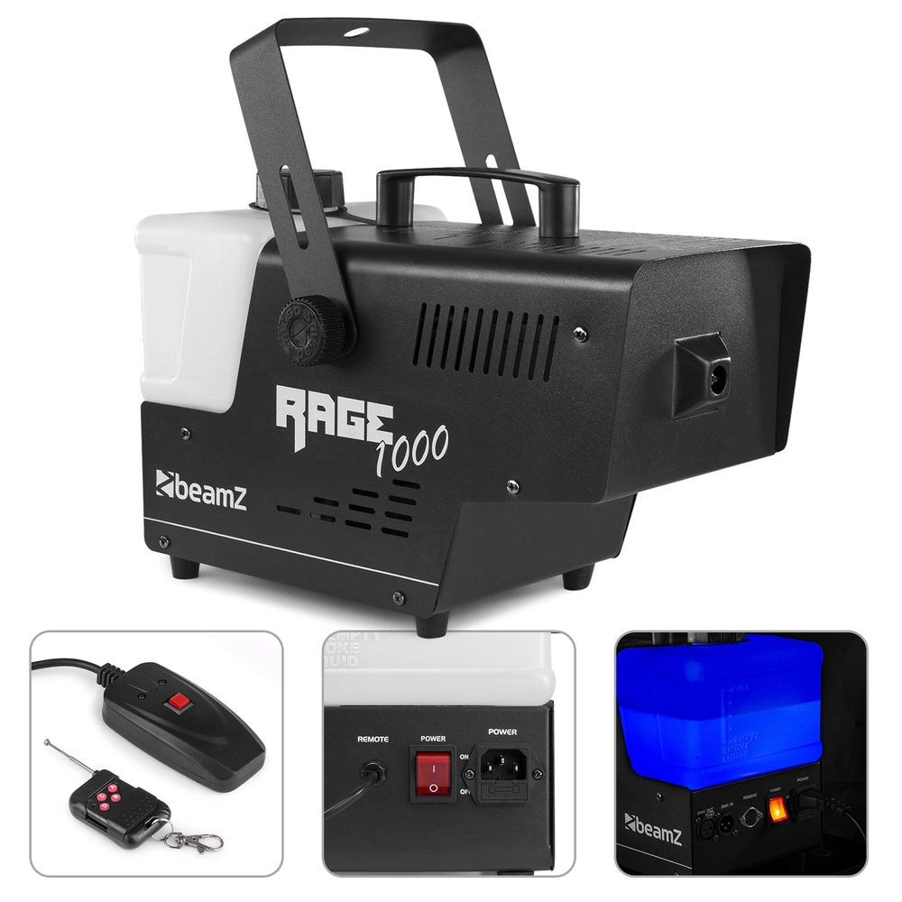 którzy chcą dużo dymu Dzięki BeamZ RAGE1000 masz potężną maszynę do dymu o mocy 1000W do wytwarzania dużej ilości dymu. Maszyna jest wyposażona w duży 2- litrowy zbiornik, dzięki czemu można ją napełnić odpowiednią ilością płynu do dymu na wiele wieczornych imprez. Pod zbiornikiem umieszczono diodę LED, która w czytelny sposób wskazuje poziom cieczy w zbiorniku. Dzięki dużej mocy 1000W RAGE1000 jest w stanie wyprodukować nie mniej niż 125 m³ na minutę. To sprawia, że RAGE1000 jest idealną maszyną na większe imprezy.