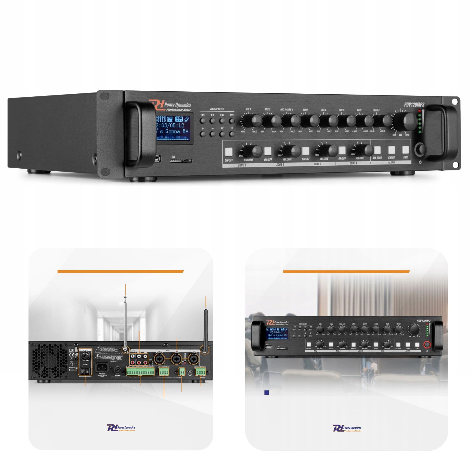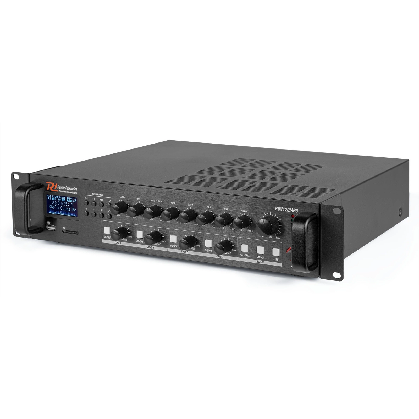 Power Dynamics PDV120MP3 to wzmacniacz 100 V z 4 strefami, które można oddzielnie włączać i wyłączać, ale można też osobno ustawić głośność. Ta opcja ułatwia skonfigurowanie wielostrefowego systemu nagłośnienia do dostarczania muzyki na przykład w branży gastronomicznej lub w miejscach publicznych. PDV120MP3 ma moc 120W do sterowania podłączonymi głośnikami. Wzmacniacz wyposażony jest również w Bluetooth, odtwarzacz MP3, radio i oczywiście wejścia liniowe dla mikrofonu i innych źródeł dźwięku. Z PDV120MP3 jako jednostką centralną, można połączyć wielostrefowy system nagłośnienia lub system nagłośnienia. Wzmacniacz jest wyposażony w „uszy”, dzięki czemu możliwy jest montaż w szafie 19”.