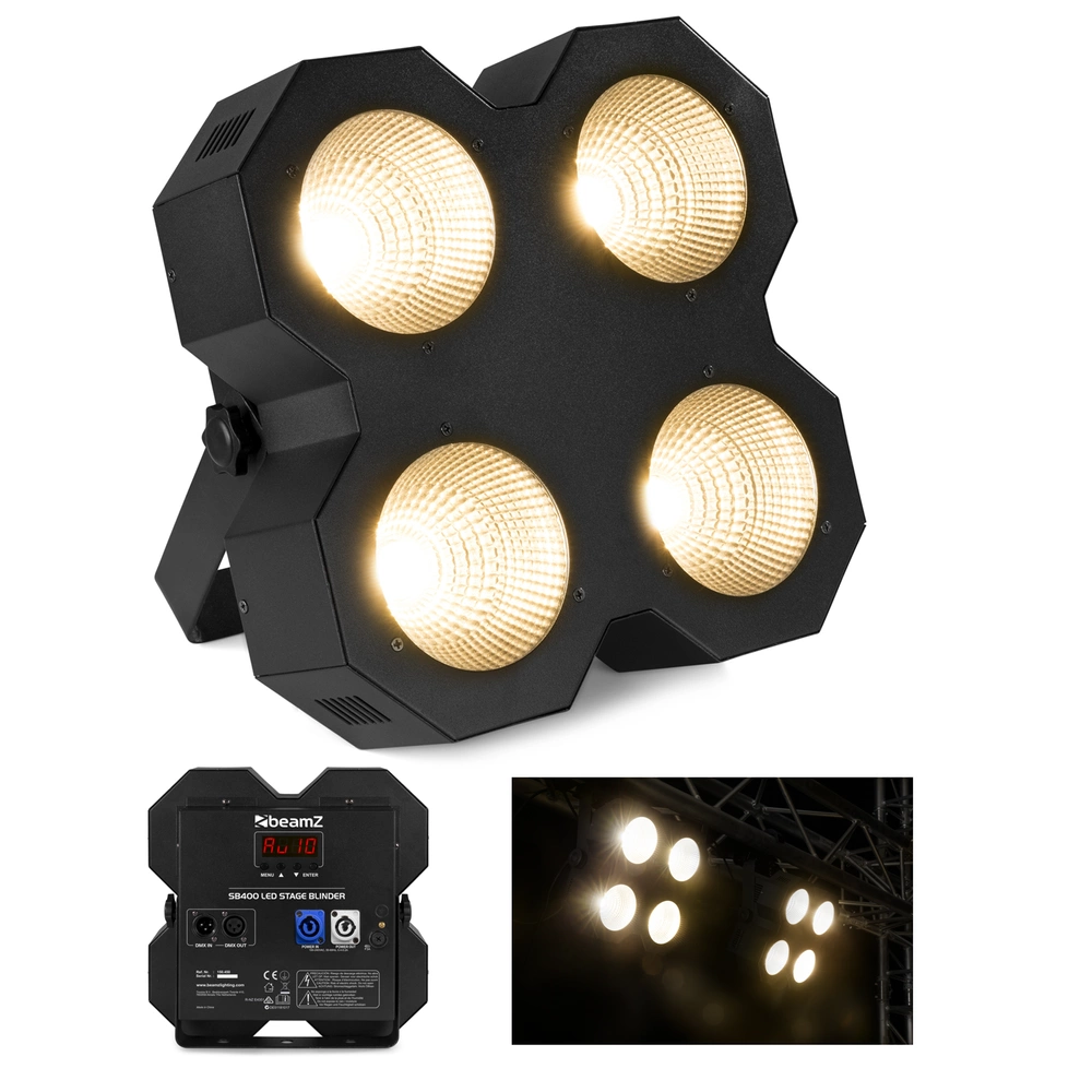 SB400 Stage Blinder to mocny reflektor oświetleniowy LED o solidnej konstrukcji z 4x diodami LED 50W Chip-on-Board (COB), która łączy w sobie dwa efekty. Oprócz blindera scenicznego urządzenie to może być również używane jako stroboskop. SB400 może być sterowany w trybie autonomicznym, trybie aktywacji dźwiękiem lub bezpośrednio przez DMX w trybie 8-kanałowym. Diody LED mają żywotność do 100 000 godzin. Kolor diod LED jest ciepły biały.