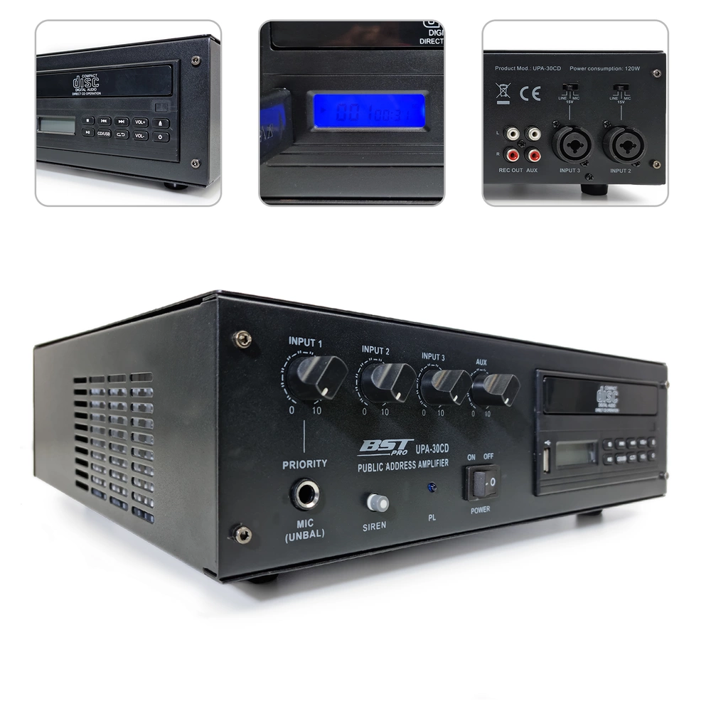 to instalacyjny jednostrefowy wzmacniacz miksujący. Mikser posiada wbudowany odtwarzacz MP3 CD/ USB oraz wyświetlacz LCD. Do nagrywania służy złącze RCA.