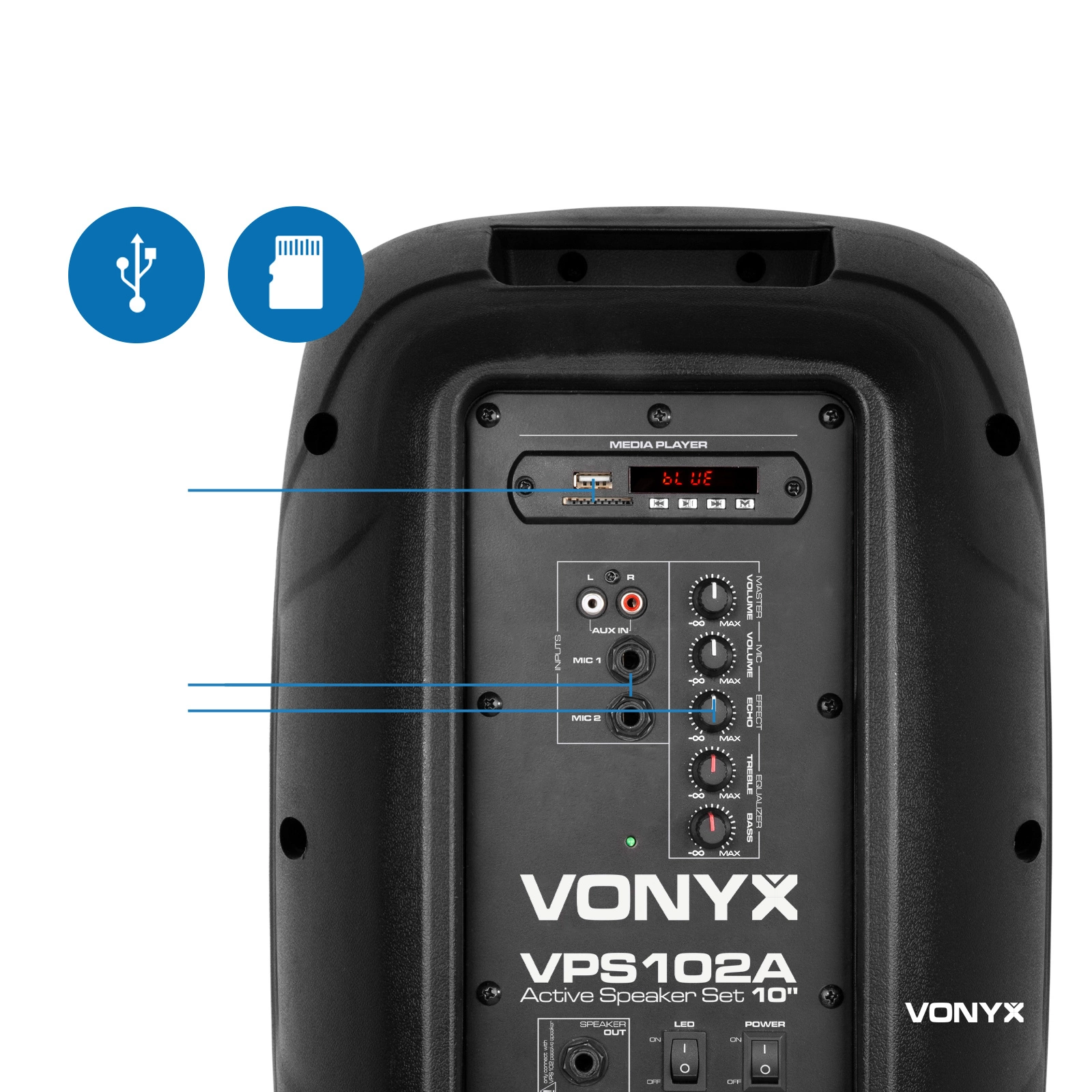 Wygoda służy ludziom i o to właśnie chodzi w VPS102A firmy Vonyx. Kompletny zestaw z dwoma głośnikami, statywami, kablami, pilotem i ręcznym mikrofonem, dzięki czemu wszystko jest gotowe do użycia w mgnieniu oka po otrzymaniu. Aby korzystać z tego zestawu, wystarczy podłączyć tylko dwa kable. Dzięki wielu opcjom, VPS102A może być używany wielofunkcyjnie. Lubisz śpiewać, ale nie jesteś jeszcze gotowy na dużą profesjonalną instalację? Ten system dźwiękowy jest idealnym wyborem. Zestaw nadaje się oczywiście do wielu innych celów, ogranicza Cię tylko wyobraźnia.