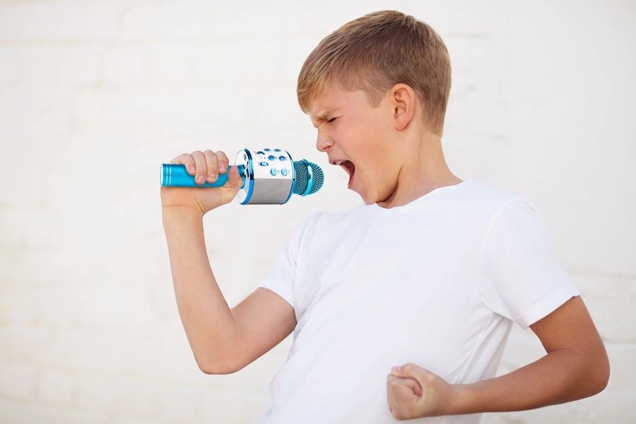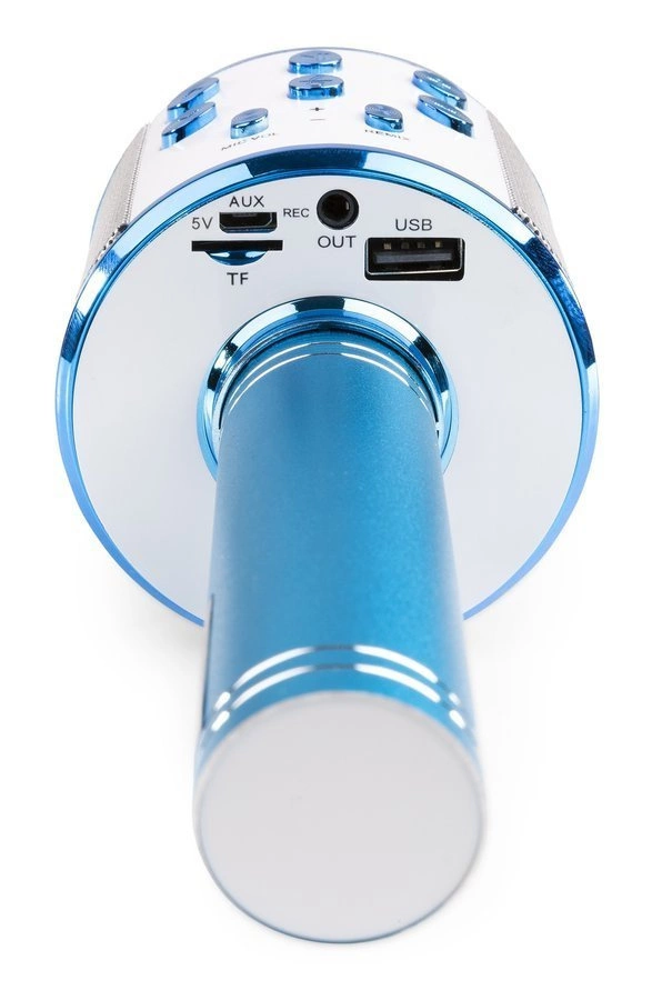MAX KM01 to niebieski mikrofon karaoke z wbudowanym wzmacniaczem i głośnikiem.