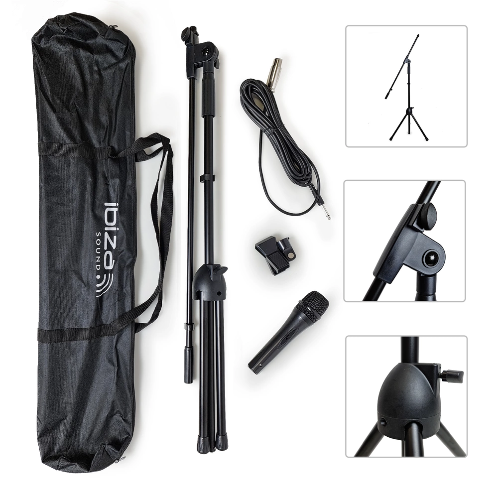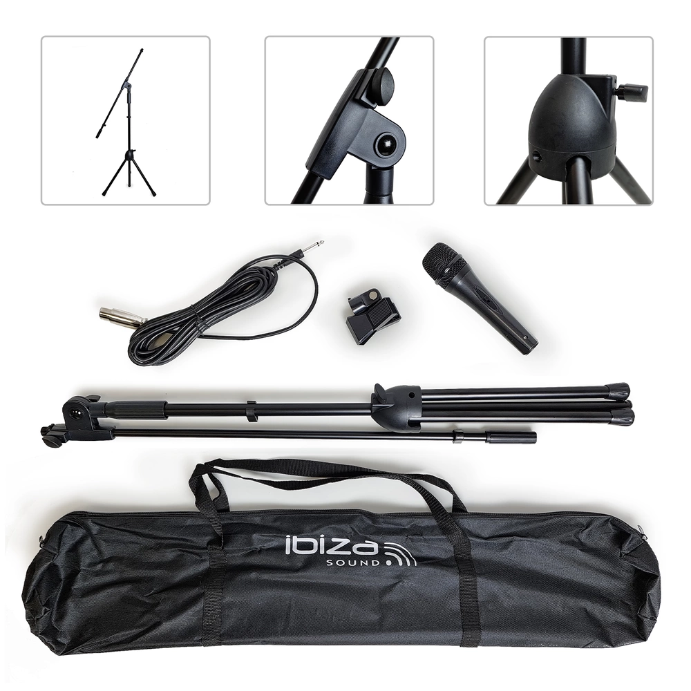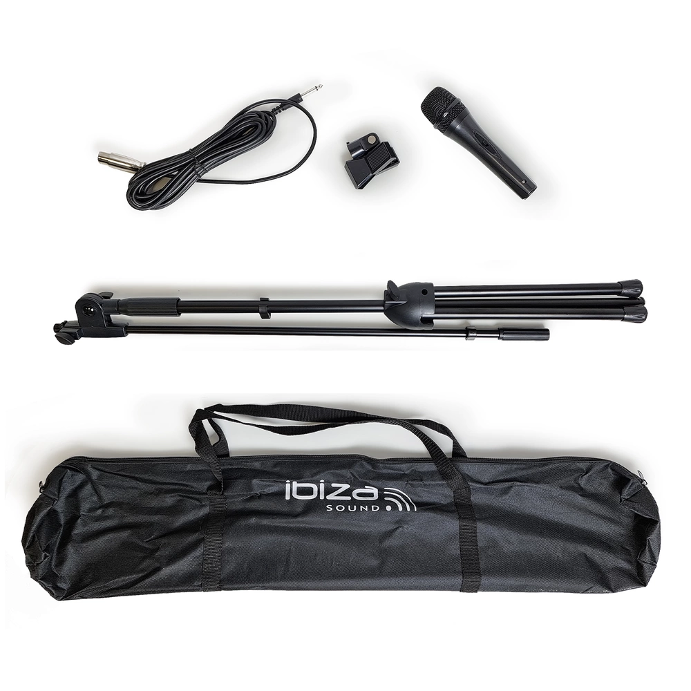 Kompletny funkcjonalny zestaw z dynamicznym mikrofonem wokalnym marki Ibiza. W skład zestawu wchodzą: mikrofon, statyw z uchwytem, kabel mikrofonowy oraz torba do przenoszenia całości. Sprzęt przeznaczony jest do profesjonalnego użytku, poszczególne elementy są dobrze spasowane i wykonane.