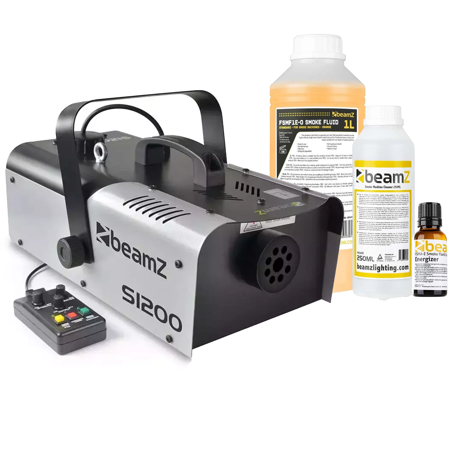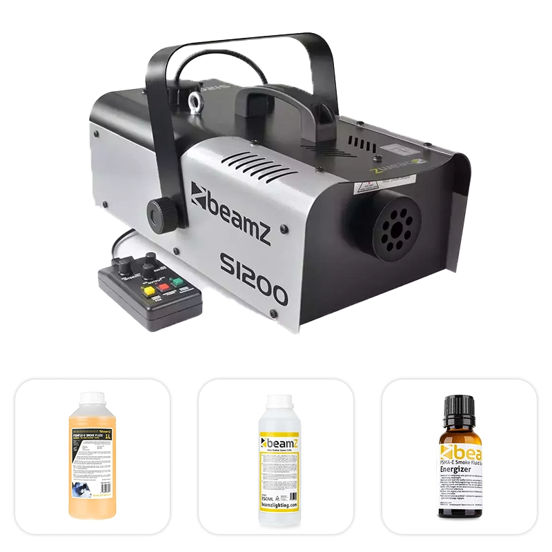 Zestaw: Wytwornica dymu 1200W S1200MKII+ płyn do dymu 1l+ płyn do czyszczenia wytwornic+ zapach Beamz