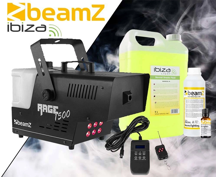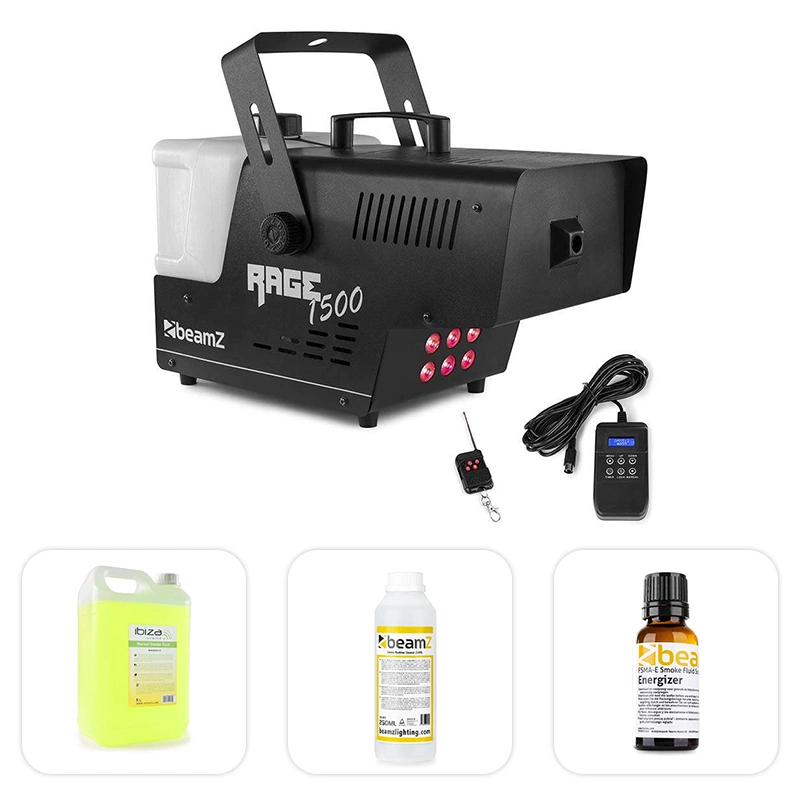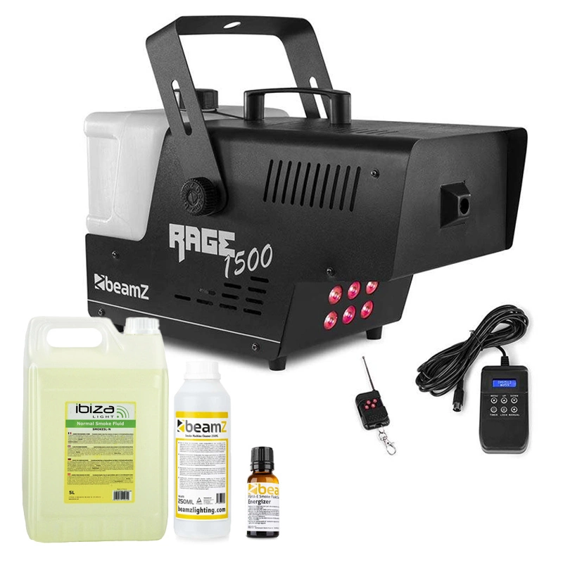 Zestaw: Wytwornica dymu LED 1500W Rage1500LED+ płyn do dymu 5l+ płyn do czyszczenia wytwornic+ zapach Beamz