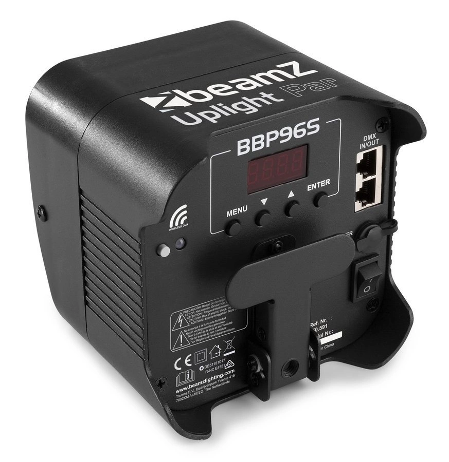 LED PAR BBP96S w układzie 6x 12W RGBWA-UV to profesjonalny bezprzewodowy reflektor od marki BeamZ. Wyposażony w akumulator o mocy 9,6 Ah zapewnia aż do 9 godzin pracy. Urządzenie umożliwia do wykorzystania oprócz standardowego RGB (czerwony, zielony, niebieski) także kolory amber (bursztynowy), biały oraz efekt UV - odznaczający się na białych powierzchniach. Oświetlacz bateryjny posiada wbudowany odbiornik bezprzewodowy DMX. Reflektor ma zaprogramowane automatyczne programy oraz możliwość sterowania dźwiękiem lub kontrolerem DMX. Do urządzenia dołączony jest pilot na podczerwień do zdalnego sterowania.