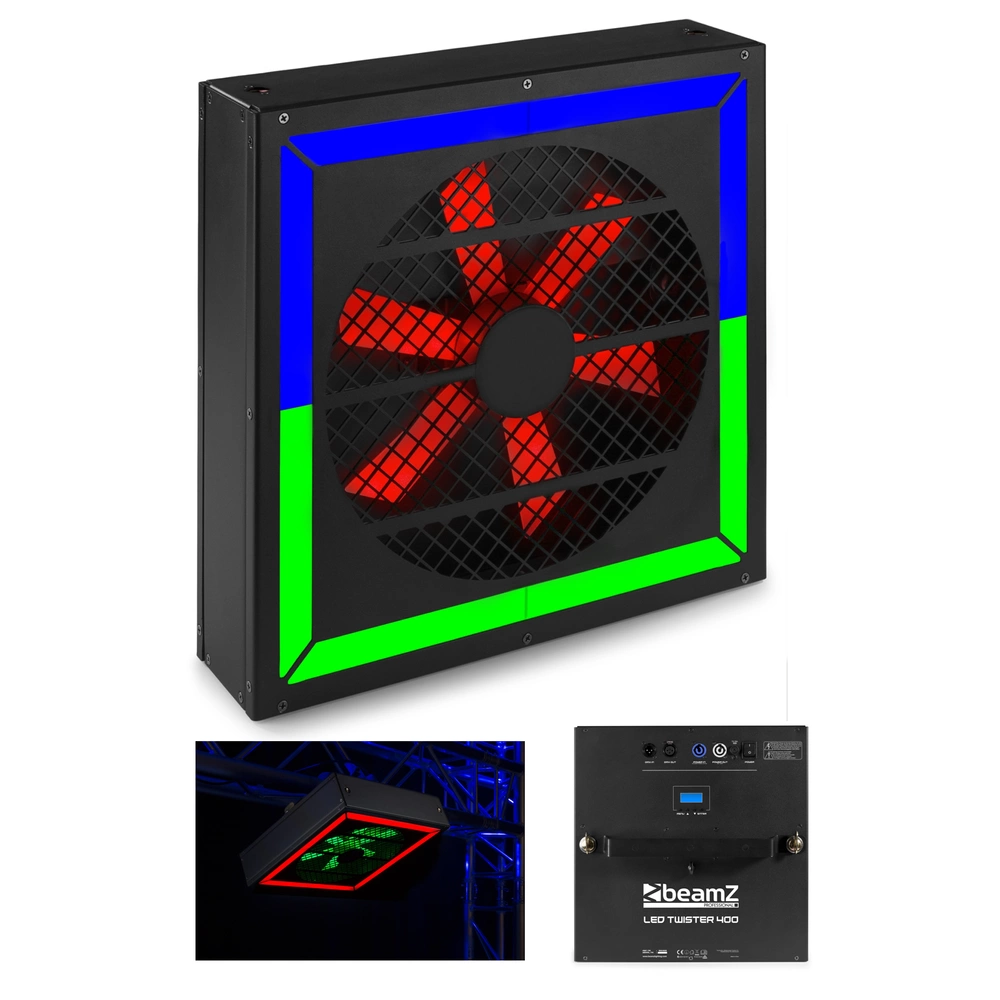BeamZ Twister 400 jest wyposażony w 116 diod LED zapewniających kolorowe efekty. Wokół Twister 400 znajduje się listwa LED z 80 diodami, podzielona na 8 sekcji (2 sekcje na stronę, 10 diod na sekcję). Sekcjami tymi można sterować niezależnie od siebie, dzięki czemu można tworzyć za ich pomocą zabawne efekty. Twister 400 zawiera również diody LED, które zapewniają oświetlenie wentylatora. Te diody LED (36 sztuk) można oczywiście sterować niezależnie od sekcji paska LED, aby uzyskać ładny kontrast. Twister 400 naprawdę przyciąga wzrok, szczególnie w przypadku korzystania z wielu jednostek.